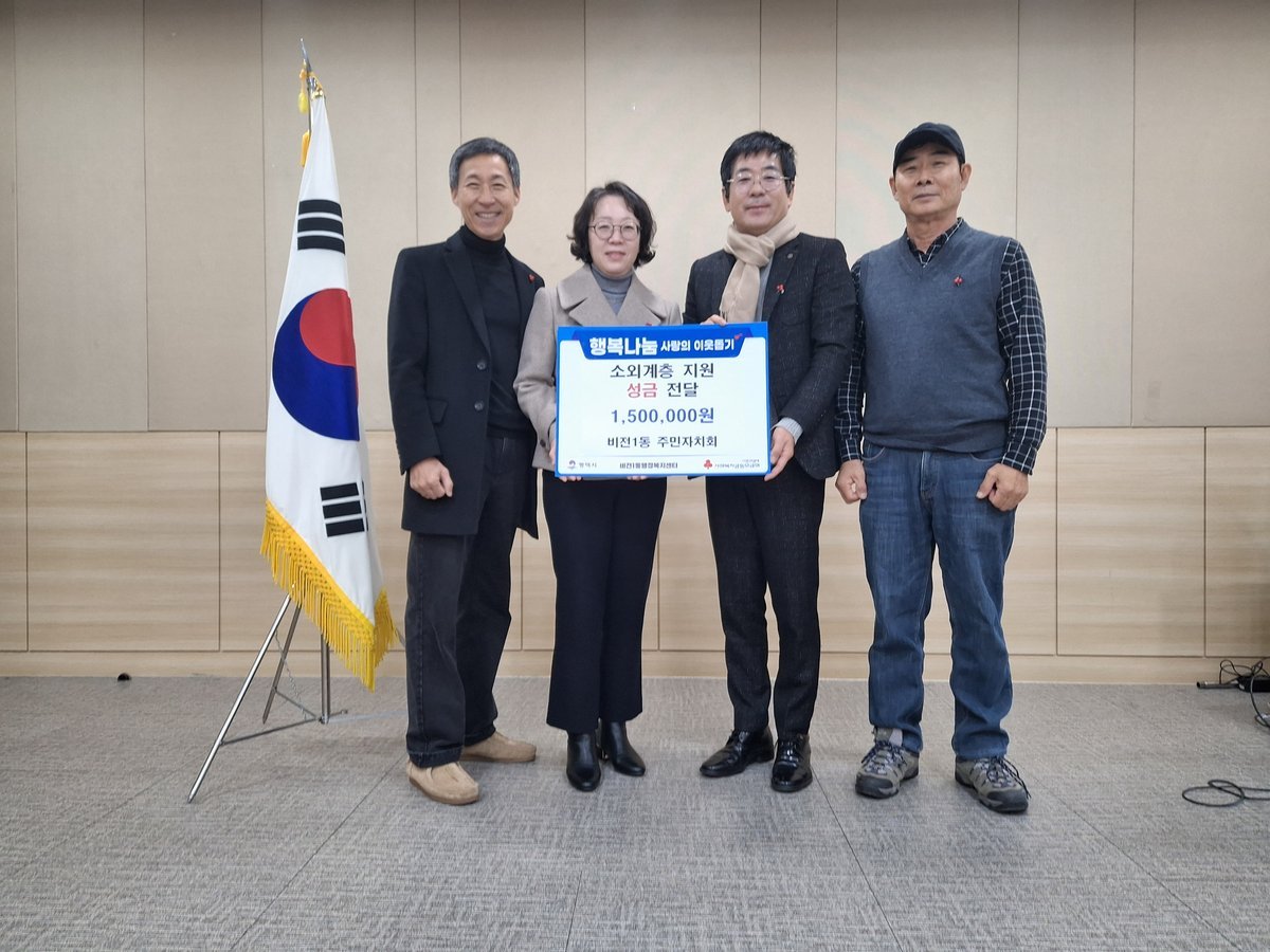 비전1동 주민자치회는 비전1동 행정복지센터에 방문하여 취약계층을 위한 이웃돕기 성금 150만원을 기부했다. 이번 성금은 추운 겨울, 어려움을 겪는 이웃들에게 따뜻한 온기를 전하고자 마련되었다.