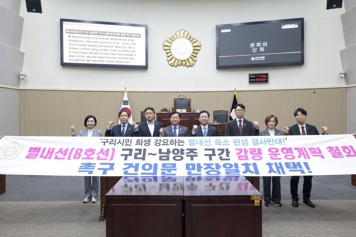 이에 구리시의회는 구리, 남양주와의 합의 및 공론화 절차 없이 추진한 일방적 행정을 규탄하며 △별내선 구리-남양주 구간에 대한 열차 감량 운행계획 즉각 철회 △출퇴근 시간대 배차 간격 현행 유지 및 시민 불편 최소화를 위한 실질적인 대안 마련 △향후 광역철도 운행과 관련한 중대한 변경 사항에 대해 비용 분담 지방자치단체와의 사전 합의 및 공론화 절차 이행 △국토교통부에 대해 교통 편익과 광역교통의 공공성을 최우선으로 고려하여 철도안전관리체계 심의의 즉각 중단 및 엄정한 지도·감독 요구를 내용으로 한 결의안을 만장일치로 채택했다.
