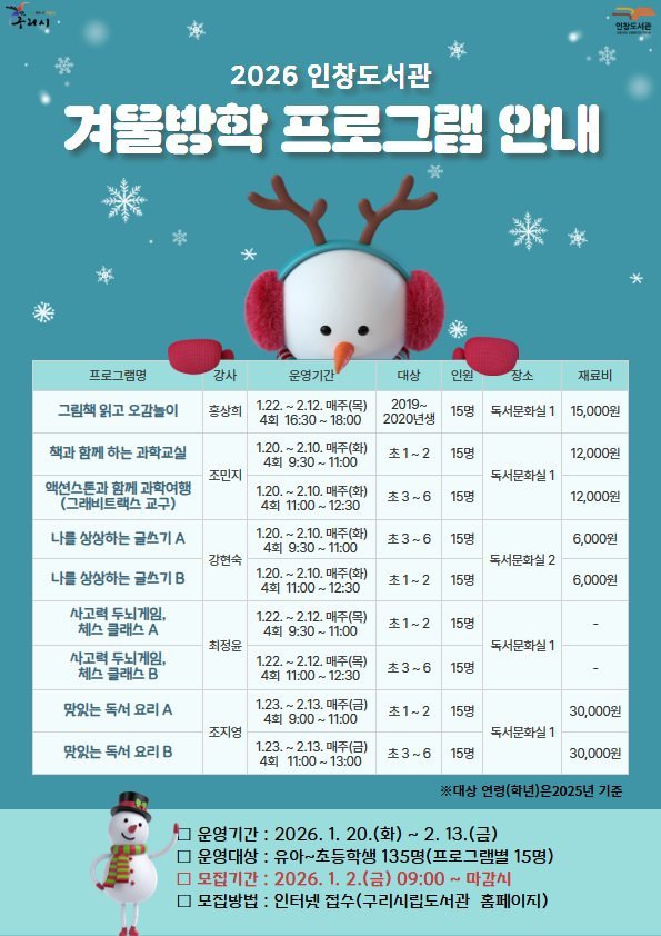 인창도서관 인창도서관은 1월 20일부터 2월 13일까지 초등 문해력 향상을 위한 글쓰기 수업 ‘나를 상상하는 글쓰기’를 비롯해, 책 읽기를 통해 과학 원리를 배우는 ‘책과 함께하는 과학 교실’, 그래비트랙스 교구를 활용한 ‘액션스톤과 함께 과학여행’, ‘체스클래스’, ‘맛있는 독서 요리’등 다양한 특강 프로그램을 운영해 따뜻한 겨울방학 학습의 기회를 제공한다.