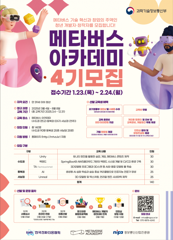 가상융합세계 기술 혁신과 창업의 주역인 청년 개발자·창작자를 모집한다 [PEDIEN] 과학기술정보통신부는 가상융합산업 분야 기술 혁신과 창업을 선도할 청년 개발자와 창작자를 양성하기 위해 ‘가상융합세계 교실’ 제4기 교육생을 2월 24일까지 공개 모집한다고 밝혔다. ‘가상융합세계 교실’은 과제 중심의 실무 맞춤형 교육을 통해 가상융합산업 현장에 즉시 투입 가능한 청년 개발자와 창작자를 양성하고 취·창업을 지원하는 전문인력 양성사업이다. 2022년에 시작된 이래, 사업화 가능한 수준의 과제 153건 도출, 기업 수요 기반의 전문인력 791명 양성 등의 성과를 거두며 주목받고 있다. 올해는 확장현실, 인공지능, 백엔드, 기술적 창작 지원자 등 5개의 분야의 전공교육과 공통교육, 과제 협업 등을 통해 개발자와 창작자 총 140명을 양성할 계획으로 학력·경력·지역·전공 등을 불문하고 가사융합세계 서비스 개발 및 작품 창작에 관심이 있는 39세 이하의 청년은 누구나 지원이 가능하다. 이번 교육생 선발 과정은 ‘온라인 면접’을 통해 지원자의 참여 의지와 기본 직무 소양 등을 심층적으로 평가할 예정이며 지원자의 기술 역량 수준을 확인할 수 있는 ‘코딩평가’도 병행해 진행된다. 정규과정에 앞서 비전공자 교육생을 대상으로 전공별 기초교육이 진행될 예정이며 정규과정에서는 전문 강사와 담당 지도자가 참여해 중급 이상의 가상융합세게 전문가로 성장할 수 있도록 전공교육과 공통교육을 지원한다. 이후, 융합 과제에서는 사업화를 목표로 다양한 전공의 교육생들의 협업과 전문가 지도를 통해 가상융합세계 서비스를 개발할 계획이다. 또한, 과제의 최종 결과물은 ‘가상융합세계 개발자 경진대회’에 의무적으로 출품되고 대회 진행과정에서 과제 고도화를 위한 세계적 가상융합세계 기업의 기술 지원과 지도 등이 추가적으로 제공된다. 우수한 성적을 거둔 수상팀에게는 과기정통부장관상과 상금, 한국 가상융합세계 축제 2025 전시, 후원기업과의 공동 사업화 등의 혜택도 주어진다. 아울러 이번 ‘가상융합세계 교실’ 제4기는 지역 청년들의 교육 수요를 반영하고 지역 기업들의 인력 수요에 대응하기 위해 수도권뿐만 아니라, 동북권과 서남권에서도 운영할 계획이다. 최종 선발된 교육생에게는 창작 공간, 개인용 컴퓨터 및 소프트웨어, 교육훈련비 등이 지원되며 우수 교육생에게는 가상융합세계 기업 직무실습 기회, 기업설명회 자료 제작 지원 등의 특별한 취·창업 지원혜택도 제공된다. 과기정통부 황규철 소프트웨어정책관은 “미래 신산업인 가상융합산업 분야 기술 혁신과 창업 활성화를 위해서는 청년인재 양성이 무엇보다 중요하다”고 강조하며 “뜨거운 열정과 창의적인 아이디어를 가진 청년들의 적극적인 참여를 기대하며 가상융합세계 교실이 청년들에게 취·창업 등 진로 개척에 실질적인 도움이 될 수 있도록 적극 지원하겠다”고 밝혔다. 제4기 ‘가상융합세계 교실’에 참여를 희망하는 청년들은 가상융합세계 교실 누리집 및 한국전파진흥협회 누리집을 통해 자세한 내용을 확인할 수 있다. -