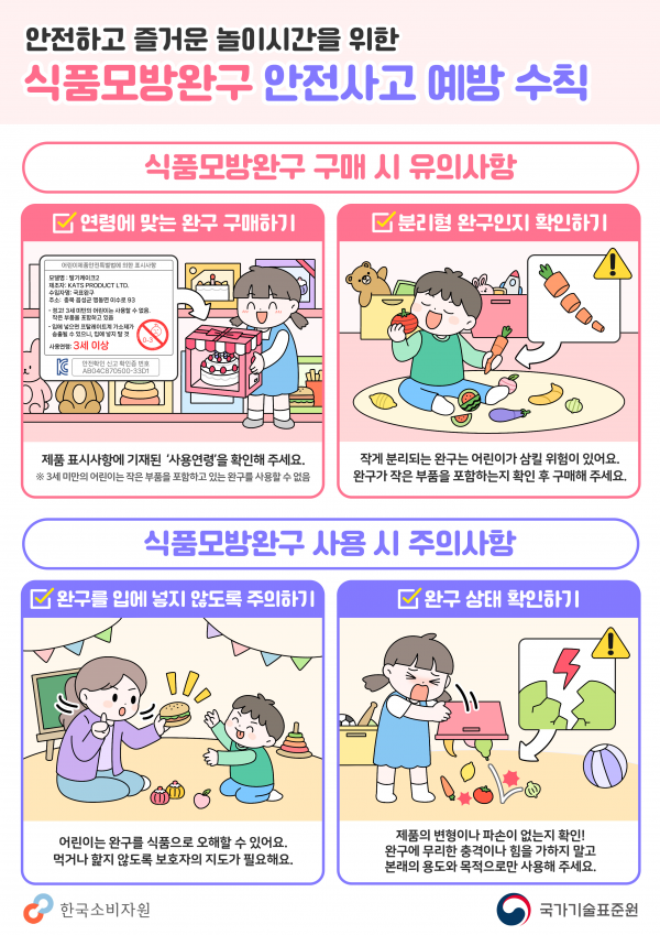 식품모방완구 놀이 시 안전사고 유의하세요 [PEDIEN] 산업통상자원부 국가기술표준원과 한국소비자원은 식품과 유사한 형태의 완구로 놀이 시 어린이 안전사고 발생에 주의를 당부했다. 최근 5년간 어린이 ‘이물질 삼킴 또는 흡인’ 사고는 증가 추세이며 동 사고의 주요 위해품목으로 ‘완구’ 가 가장 높은 비중을 차지하고 있다. 특히 식품과 유사한 모양으로 제작된 완구는 어린이가 식품으로 오인하거나, 작은 부품이 분리되어 삼키는 등의 사고 발생 우려가 있어 완구 구매와 사용 시 안전수칙을 숙지해 사고를 예방하는 것이 필수적이다. 국표원과 소비자원은 식품모방완구의 안전한 사용을 위해 △ 제품 구매 시 KC 인증 마크와 사용 연령 확인, △ 작은 부품이 포함되어 있는지 확인, △ 보호자의 지도하에 사용하고 입에 넣지 않도록 주의, △ 무리한 충격을 가하지 않고 본래 용도로만 사용할 것 등을 당부했다. 아울러 양 기관은 식품모방완구 놀이 시 어린이 안전사고 예방을 위한 안전사용 수칙을 담은 홍보 포스터를 제작해 어린이집안전공제회, 소비자 관련 단체 등을 통해 배포할 계획이다. -