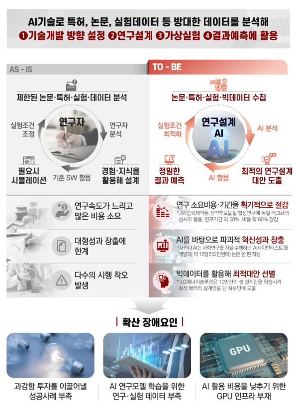인공지능을 활용한 산업·에너지 기술개발 본격 추진 [PEDIEN] 산업통상자원부는 11월 6일부터 27일까지 3주간 인공지능 기술을 활용해 기술개발을 추진하고자 하는 기업·대학·연구소 등 대상으로 산업·에너지 전문기관들과 함께 기술개발 통합수요조사를 실시한다. 이는 지난 10월 17일 발표한 ‘AI + R&DI 추진전략’의 후속조치이며 산업 전반에 AI 기술을 활용한 기술개발을 확산시켜 기술개발의 한계를 돌파하고 산업 혁신의 비용은 줄이고 속도와 성과는 높이기 위한 것이다. 산업부는 30년까지 600개의 인공지능 활용 기술개발 프로젝트를 지원하고 ‘32년까지 가용한 신규 연구개발 예산 100%를 투자할 계획이다. 이번에 접수하는 과제는 크게 두 가지로 구분된다. 첫 번째는 AI 기술을 활용해 방대한 연구데이터를 분석하고 기술개발 방향을 설정하는 연구설계솔루션, 두 번째는 AI와 로봇공학을 통해 반복적이고 위험한 실험을 자동으로 수행하는 AI 자율실험실이다. 산업부는 AI 활용 기술개발 과제들을 별개로 추진하지 않고 초격차 프로젝트 등 기존 산업·에너지 기술개발 과제에 AI를 적용해 시너지를 극대화할 수 있는 아이디어를 모으고 이를 집중 지원할 예정이다. 기존에 기술개발 수요를 제기했던 기업·대학·연구소들도 기술개발 과정에 AI 기술을 활용하는 방안을 보완해 추가로 수요를 접수 할 수 있다. 산업현장 기업과 연구자들은 산업기술기획평가원, 에너지기술평가원, 산업기술진흥원 홈페이지에서 이번 통합 수요조사 공고에 대한 자세한 내용을 확인하고 접수할 수 있다. 수요조사를 통해 접수된 AI 활용 기술개발 과제는 내년부터 신속히 지원된다. 제경희 산업기술융합정책관은 “AI 기술은 산업의 기술개발 방식을 완전히 바꾸고 있다”며 “혁신에 뒤처지지 않고 글로벌 경쟁력을 유지하려면 변화에 신속히 대응해야 한다”고 강조하고 “정부가 앞장서서 AI 활용 기술개발 지원 수요를 발굴하고 과감하게 투자를 늘려 나가겠다”고 밝혔다. -