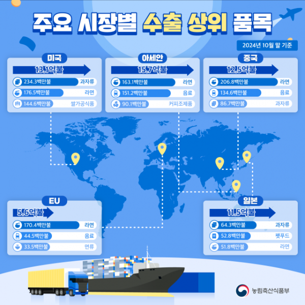10월까지 농식품 82억불 수출, 역대 최고 [PEDIEN] 농림축산식품부는 2024년 10월말 기준 농식품 수출 누적액이 지난해보다 8.9% 증가한 81억 9천만불을 기록했다고 밝혔다. 이는 14개월 연속 전년동기대비 성장세를 보인 것으로 역대 10월말 실적 중 최대 실적에 해당한다. 수출 품목별로 보면, 냉동김밥·즉석밥·떡볶이 등 쌀가공식품은 전년동기 대비 41.9% 증가한 2억 5천만불이 수출됐다. 최대 시장인 미국의 경우 전년동기대비 55.9% 증가했고 중국 시장은 지난 9월부터 냉동김밥이 신규로 수출되면서 전년동기대비 40.2% 증가했다. 수출액이 가장 많은 품목인 라면은 10월 한달간 1억 2천만불을 수출해, 10월말 누적 10억불 수출을 돌파했다. 라면은 최대 수입국인 중국, 미국을 비롯한 유럽에서 성장세를 이어가고 있고 신시장에 해당하는 중남미에는 전년동기대비 70.9% 증가한 수출 실적을 보였다. 신선식품은 전년동기대비 0.5% 증가했는데, 김치, 유자, 포도 등이 성장세를 보이고 있다. 특히 유자는 캐나다, 필리핀 등 신규 시장에 대한 수출이 꾸준히 늘면서 10월부터 증가세로 전환됐다. 캐나다에서는 대형 유통매장 입점 물량이 확대됐고 필리핀에서는 겨울을 앞두고 유자차가 감기에 좋다는 인식이 확산되면서 수출이 증가한 것으로 분석된다. 수출시장별로는 미국, 유럽이 전년동기대비 20% 넘는 증가세를 보이고 있고 중국과 아세안도 지속 성장하고 있다. 농식품부는 미국, 중국, 일본에 집중된 수출시장 확대를 위해 세계 인구의 30%가 거주하는 중동, 중남미, 인도라는 3대 신시장에 대한 홍보, 마케팅 등을 강화했다. 10월말부터는 사우디아라비아, 멕시코, 인도에서 팝업스토어를 운영한다. 케이-푸드를 전시·판매할 뿐만 아니라 요리교실, 바이어 상담회도 개최하는 복합 공간으로 한달여간 운영한다. 인도의 경우 홍대, 성수동, 한강 등 인기 관광지 컨셉으로 꾸몄고 사우디의 경우 할랄 제품을 전면 배치하는 등 현지 소비자의 관심사와 케이-푸드를 엮어서 소비 확대를 추진한다. 한편 수출 성장세를 보이고 있는 과자·음료 수출기업도 라면 수출기업에 이어 국내 소비자들과 수출 성과를 나누기 위한 할인 행사를 진행한다. 매일유업은 요거트, 요구르트, 치즈 등 유제품을 최대 50%, 롯데웰푸드는 마가렛트, 카스타드, 꼬깔콘, 치토스 등 과자류를 최대 33%, 롯데칠성음료는 칠성사이다, 펩시콜라, 밀키스 등 탄산음료를 11월 중 최대 50%까지 할인된 가격에 대형마트, 창고형 매장, 편의점을 통해 판매한다. 농식품부 양주필 식품산업정책관은 “중동사태, 미국 대선 등 국제 정세의 불확실성 등이 있으나, 바이어 초청 상담회 등을 통해 케이-푸드의 해외유통매장 입점 확대를 유도하고 수출 최대 실적 달성을 위해 연말 온오프라인 판촉·홍보를 확대해 나가겠다”고 밝혔다. -
