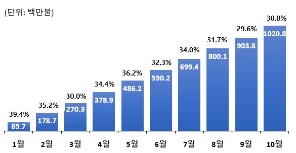 [PEDIEN] 【총괄】‘24.10월 수출은 전년 동월 대비 +4.6% 증가한 575.2억 달러, 수입은 +1.7% 증가한 543.5억 달러, 무역수지는 +16.2억 달러 증가한 +31.7억 달러 흑자를 기록했다. 【수출】10월 수출은 역대 10월 중 1위 실적인 575.2억 달러를 기록하면서 올해 8월부터 3개월 연속 월별 최대실적을 경신하는 가운데 13개월 연속 플러스 흐름을 이어갔다. 【품목】10월에는 15대 주력 수출 품목 중 10개 품목 수출이 증가했다. 우리 최대 수출 품목인 반도체 수출은 125억 달러로 역대 10월 중 최대실적을 6년 만에 경신하면서 12개월 연속 증가 흐름을 이어갔다. 컴퓨터 수출도 두 자릿수 증가한 10억 달러로 10개월 연속, 무선통신기기는 20억 달러로 8개월 연속 증가했다. 2위 수출 품목인 자동차 수출은 전년 동월 대비 +5.5% 증가한 62억 달러를 기록, 10월 기준 최대실적을 달성하면서 2개월 연속 월별 최대 수출실적을 경신했다. 자동차 부품 수출도 +5.9% 증가한 19억 달러를 기록하면서 3개월 만에 플러스로 전환됐다. 바이오헬스 수출은 +18.5% 증가한 12억 달러로 4개월 연속 증가했다. 철강 수출은 +8.8% 증가한 29억 달러를 기록, 2월부터 8개월간 지속된 마이너스 흐름을 끊고 9개월 만에 증가세로 전환됐다. 아울러 석유화학은 2개월 만에, 섬유·가전 수출은 3개월 만에 플러스를 기록했다. 한편 석유제품 수출은 유가와 연동되는 제품단가 하락 등의 영향으로 전년 동월 대비 △34.9% 감소한 34억 달러를 기록했다. 【지역】10월에는 9대 주요 시장 중 5개 시장에서 수출이 증가했다. 대중국 수출은 1·2위 수출 품목인 반도체와 석유화학 수출이 크게 증가하면서 ‘22.9월 이후 25개월 만에 최대치인 122억 달러를 기록, 8개월 연속 증가세를 이어갔다. 대미국 수출은 역대 10월 중 최대실적인 104억 달러를 기록하면서 15개월 연속 월별 최대실적을 경신했다. 대EU 수출은 53억 달러로 무선통신기기와 바이오헬스 수출이 호조세를 보이면서 3개월 연속 플러스 흐름을 이어갔다. 【수입】10월 수입은 543.5억 달러로 +1.7% 증가했다. 에너지 수입은 가스 수입은 증가했으나, 유가 하락에 따른 원유 수입 감소로 112억 달러를 기록했다. 에너지 외 수입은 432억 달러로 반도체·반도체 장비를 중심으로 +4.1% 증가했다. 【무역수지】10월 무역수지는 전년 동월 대비 +16.2억 달러 증가한 +31.7억 달러 흑자를 기록하면서 17개월 연속 흑자 흐름을 이어갔다. 1~10월 누적 무역수지도 ‘18년 이후 최대 흑자 규모인 399억 달러 흑자를 기록했다. 【평가】10월 우리 수출이 보여준 성과는 수출기업과 대통령 이하 정부 부처 및 수출지원기관이 함께 ‘수출 원팀 코리아’로서 힘써온 결과이다. 안덕근 산업통상자원부 장관은 “우리 양대 수출 품목인 반도체, 자동차 수출이 10월 기준 1위 실적을 경신하고 전체 수출도 3개월 연속 월별 최대실적을 기록하는 등 우리 수출이 견조한 증가 흐름을 이어가고 있다”고 하면서 “△중동 사태, 러·우 전쟁 등 리스크 요인들이 어느 시점에 종식될지 가늠하기 어려운 가운데, △미 대선 이후 대외 통상환경의 불확실성도 상존하고 있어 이에 대한 면밀한 점검도 필요한 상황이다”고 평가했다. 【정책 방향】안 장관은 “수출 호조세가 연말까지 이어져 역대 최대 수출실적 달성으로 나아갈 수 있도록, 민관 원팀으로 수출 확대에 모든 가용한 자원을 집중해 총력 지원하겠다”고 밝혔다. 이를 위해 “최근 ‘수출 붐업 코리아 위크’에서 우리 수출기업과 해외 바이어간 진행한 수출 상담이 연내 수출실적으로 빠르게 이어질 수 있도록 적극 지원하는 한편 연말까지 수출 현장 지원단을 집중 운영하면서 우리 수출기업의 현장 애로를 적극 발굴하고 즉시 해소해 나가겠다”고 했다. 한편 안 장관은 “미 대선 결과에 따라 미국의 경제·통상 정책 등에도 변화가 예상되는 등 우리 통상환경에 불확실성이 높아진 상황”이라고 하면서 “산업부는 예상 가능한 모든 시나리오에 대해 산업·통상·무역·에너지 등 분야별 영향을 면밀히 분석하고 있으며 주요 업계·경제단체·전문가 등과 민관 합동으로 대응 전략을 마련해 우리나라의 국익과 업계 이익을 최대한 확보하기 위해 적극 노력할 계획”이라고 밝혔다. -
