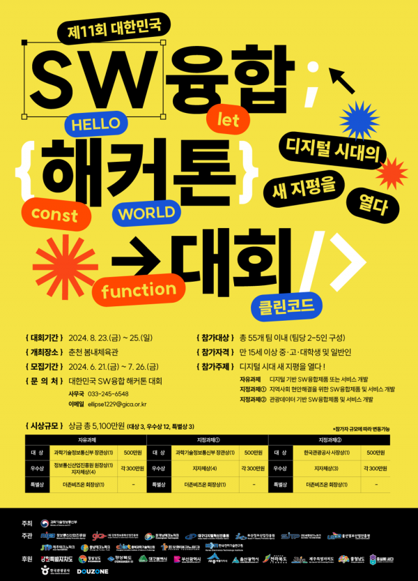 [PEDIEN] 과학기술정보통신부는 지역에서 소프트웨어를 활용한 창의적인 아이디어와 신서비스를 발굴하고 지역 디지털 혁신 성과를 확산하기 위한 제11회 ‘대한민국 소프트웨어융합 경진 대회’를 강원도 춘천시에서 8월 23일부터 25일까지 개최한다.