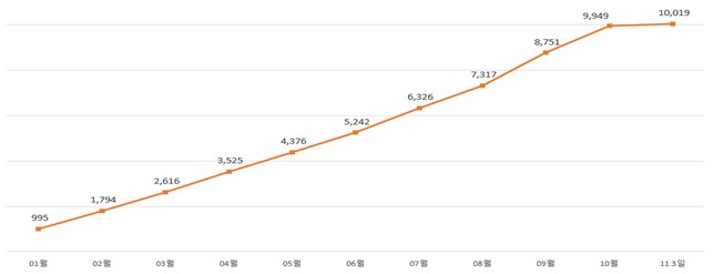 2025년 월별 누적 거래 금액 [PEDIEN] 농림축산식품부는 농수산물 온라인 도매시장의 연간 거래액이 11월 3일 기준 1조 원을 넘어섰다고 발표했다.이는 전년 동기 대비 약 2.9배 증가한 수치로, 현재 추세라면 연말까지 1조 1,700억 원의 거래 실적을 달성할 것으로 전망된다.온라인 도매시장은 생산자와 소비자가 직접 참여하여 실시간으로 거래하는 플랫폼으로, 농식품부가 운영하고 있다. 시간과 장소에 제약 없이 비대면 거래가 가능하다는 장점 덕분에 기존 도매시장의 유통 단계 축소와 물류비 절감 효과를 가져오고 있다.실제로 일평균 거래 금액은 18.4억 원에서 32.6억 원으로 약 77% 증가했으며, 참여 업체 수도 3,804개소에서 5,272개소로 약 39% 늘었다.품목별로는 청과가 전체 거래의 46.4%를 차지하며 가장 높은 비중을 보였고, 축산(40.5%), 양곡(8.2%), 수산(4.9%)이 뒤를 이었다.특히 청과류의 산지 직거래 비중은 작년 28%에서 올해 44.1%로 크게 확대되었으며, 도매시장을 거치지 않는 직배송 비율 또한 65.7%에서 75.9%로 증가했다. 이는 온라인 도매시장이 유통 단계를 줄이고 배송 효율을 높여 가격 경쟁력을 확보했다는 것을 의미한다.경상권의 한 식자재마트는 강원도 APC와의 직거래를 통해 풋고추 등 채소류를 시중 가격보다 약 18% 저렴하게 판매하고 있다. 이 마트는 농식품부가 주관하는 산지 팸투어에 참여하여 품질을 직접 확인한 후 거래를 결정했다.농식품부는 이번 1조 원 달성을 발판 삼아 2030년까지 거래 금액 7조 원을 달성한다는 목표를 세웠다. 이를 위해 판매자 가입 요건 완화, 농업인의 가격 결정권 강화를 위한 경매 시스템 도입, 공동 물류 체계 구축 등 제도 개선과 물류 기능 고도화에 힘쓸 계획이다.농식품부 관계자는 “온라인 도매시장이 실질적인 유통 비용 절감 효과를 가져올 수 있도록 거래 실적을 지속적으로 모니터링하고, 시장 운영의 전문성과 책임성을 강화해 나갈 것”이라고 밝혔다. -
