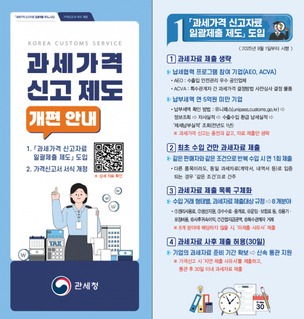 수입물품 과세자료 일괄 제출 시행 3주 차, 제출 현황과 점검 계획을 알려드립니다 [PEDIEN] 관세청은 지난 9월 1일부터 시행한 ‘ 과세가격 신고자료 일괄제출 제도’의 자료 제출 현황을 점검한 결과, 업체 참여율이 72%에 달한다고 밝혔다. 과세자료 일괄제출 제도는 통관단계에서 필수 과세자료를 미리 확보해 신고 오류를 조기에 확인·치유하고 납세자의 불필요한 과세자료 제출 부담을 경감하기 위해 도입됐다. 제출이 필요한 과세자료를 주요 8개 분야로 특정하고 소규모 업체는 대상에서 제외했으며 중복된 자료를 제출할 필요가 없게 하는 등 기업 편의를 높였다. 권리사용료, 생산지원, 수수료·중개료, 운임·보험료·기타운송관련비용, 용기·포장비용, 사후귀속이익, 간접지급금액, 특수관계자 거래 제도 시행 3주 차를 맞은 현재, 과세자료 일괄제출 대상 업체 중 약 72%가 적극적으로 자료를 제출하고 있는 것으로 나타났다. 일괄제출 대상은 전년도 납부세액이 5억원 이상인 1만여 개 업체다. 가격신고를 이미 완료해 신고 수리된 업체라도, 유니패스 시스템의 첨부서류 사후제출 기능을 활용하면 자료 제출이 가능하다. 또한 자료 제출 대상 8개 분야에 해당 사항이 없는 경우라도 ‘미제출사유서’를 제출해야 한다는 점에 유의해야 한다. 관세청은 미제출 업체에 대해 아래와 같이 단계적인 점검을 실시할 예정이다. 먼저 모든 미제출 업체에 대해 일괄 안내문을 발송한다. 안내문을 받은 업체는 신고 내용을 확인해 해당 과세자료나 미제출사유서를 제출해야 하며 미제출 시 관할 세관이 개별 점검을 실시한다. 세관 안내에도 불구하고 자료 제출 요청에 응하지 않는 업체는 담보제공 생략 중지, 월별납부업체 승인 취소 등의 납세 제재 조치를 적용받게 된다. 또한 업체의 납세 위험도에 따라서 세액심사 또는 관세조사 대상으로 선별될 수 있다. 관세청 손성수 심사국장은 “이번 제도 개편으로 업체에게 신고 오류를 조기에 치유할 수 있는 기회를 제공함으로써, 예상하지 못한 고액 추징으로부터 업체를 보호할 수 있을 것”이며 “더욱 투명한 세원 관리로 납세 공정성과 효율성을 동시에 높여나가 초혁신경제로 나아가는 과정에 이바지하기를 기대한다”고 밝혔다. -