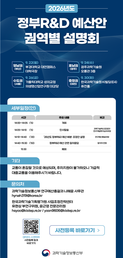 2026년도 정부 연구개발 예산안, 4개 권역별 연구현장과 만납니다 [PEDIEN] 과학기술정보통신부 과학기술혁신본부는 9월 22일부터 수도권, 충청권, 호남권, 영남권 등 4개 권역에서 2026년도 국가연구개발사업 예산안 권역별 설명회를 개최한다고 밝혔다. 이번 설명회는 2026년도 국가연구개발사업 예산 배분·조정안의 주요 내용을 산·학·연 연구자와 관련 전문가 등 정책 대상자들에게 직접 설명하고 현장의 목소리를 청취하기 위해 마련됐다. 2026년도 정부 연구개발 예산안은 총 35.3조 원 규모로 올해 대비 19.3% 증가한 역대 최대 수준이다. 이 중 국가과학기술자문회의에서 심의·의결한 주요 연구개발 예산은 30.1조 원 규모이다. 이번 예산안은 △과감한 연구개발 투자로 생산성 향상과 산업 경쟁력 강화, △연구생태계 복원을 통한 지속가능한 성장기반 마련이라는 두 축을 중심으로 마련됐다. 이번 예산안은 국회의 심의를 거쳐 연말 최종적으로 확정될 예정이다. 임요업 과학기술혁신조정관은 “이번 예산안은 단순한 연구개발 투자 규모의 확대가 아니라, 기술주도 성장과 모두의 성장을 통해 진짜 성장의 길로 나아가기 위한 전략적 투자”고 강조하며 “연구자들이 안정적으로 연구에 몰입할 수 있도록 지원하고 그 성과가 국민과 산업 전반에 확산될 수 있도록 정책적 노력을 아끼지 않겠다”고 밝혔다. -