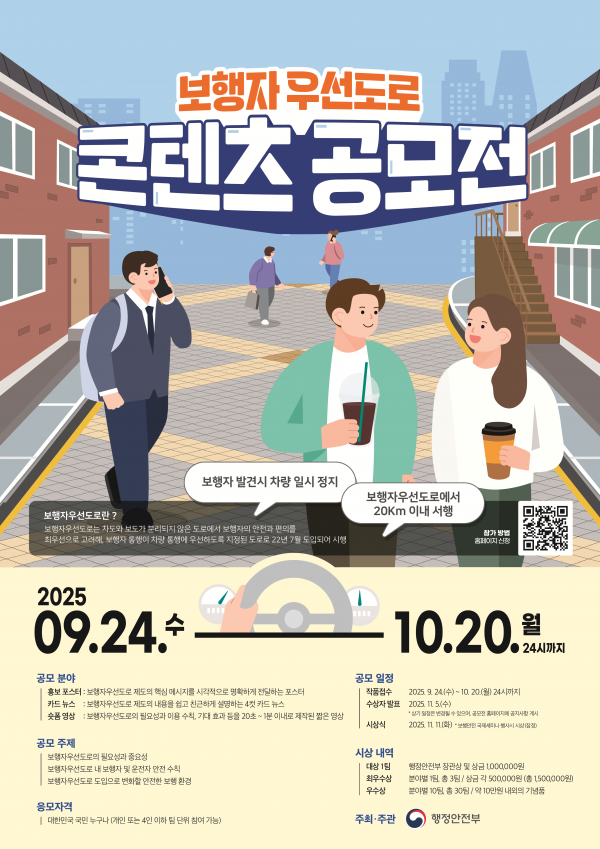 보행자 안전문화 확산을 위한 ‘보행자우선도로 홍보 콘텐츠 대국민 공모전’ 개최 [PEDIEN] 행정안전부는 보행자우선도로에 대한 국민적 관심과 이해를 높이기 위해 9월 24일부터 10월 20일까지 ‘보행자우선도로 홍보 콘텐츠 대국민 공모전’을 개최한다. ‘보행자우선도로’는 보도와 차도가 분리되지 않은 도로에서 보행자 통행이 차량보다 우선하도록 지정된 도로로 보행자 안전 확보를 위해 2022년 7월부터 지정·운영하고 있다. 공모전은 국민 누구나 개인 또는 팀으로 참가할 수 있다. 공모 분야는 보행자우선도로의 필요성과 제도 취지, 보행자 및 운전자가 지켜야 할 안전수칙을 주제로 한 포스터 카드뉴스 숏폼영상 총 3개 분야이다. 출품작 규격 등 공모전 참가를 위해 필요한 자세한 사항은 행정안전부 누리집과 공모전 누리집에서 확인할 수 있다. 접수된 작품은 전문가 심사를 거쳐 대상, 최우수상, 우수상을 수여한다. 수상작은 오는 11월 11일 서울에서 열리는 ‘제9회 보행안전 국제세미나’ 현장에 전시되며 버스정류장과 승강기 모니터 등 다양한 매체를 통해 국민에게 공개된다. 또한, 포스터와 카드뉴스는 교육·홍보에 활용될 수 있도록 안내 책자와 온라인 교육자료로 제작해 관계기관에 배포할 계획이다. 김용균 안전예방정책실장은 “보행자가 안심하고 걸을 수 있는 보행 문화 확산을 위해 이번 공모전에 많은 관심과 참여를 부탁드린다”고 말했다. -