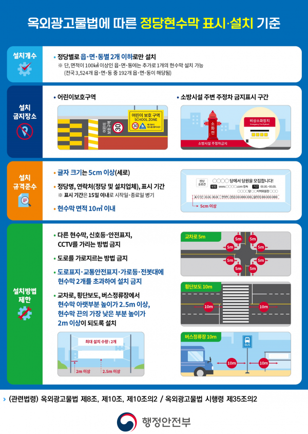 깨끗한 거리에서 맞는 따뜻한 추석명절. 불법 현수막 일제 정비 추진 [PEDIEN] 행정안전부는 9월 24일부터 10월 17일까지 3주간 불법광고물 설치 실태를 점검하고 법령 위반 현수막 일제 정비를 실시한다고 밝혔다. 이번 점검은 추석 연휴 전후 명절 인사를 겸한 정당 현수막과 일반현수막 설치가 늘어날 것으로 예상됨에 따라 불법 현수막 난립을 방지하기 위해 실시하게 됐다. 아울러 지난 22일부터 진행되고 있는 ‘대한민국 새단장 주간’ 캠페인과 연계해 추진함으로써 일제 정비의 효과를 높인다는 방침이다. 이번 점검에서는 ‘옥외광고물법’에 따른 정당 현수막 설치 개수 및 표시·설치 방법 준수 여부, 일반현수막 설치 전 신고 여부를 중점적으로 확인한다. 정당 현수막은 ‘옥외광고물법’에 따라 신고 없이 읍면동별 2개까지 15일 동안 자유롭게 설치할 수 있다. 다만, 어린이보호구역과 소방시설 주변은 설치가 금지되며 특히 보행자나 차량 운전자 시야를 가릴 우려가 있는 교차로 횡단보도 주변은 현수막 아랫부분 기준 높이 2.5m 이상으로 설치해야 한다. 정당 현수막을 제외한 일반현수막은 관할 지방자치단체에 신고 후 지정된 게시시설에만 설치할 수 있다. 각 지방자치단체에서는 담당 공무원과 옥외광고협회 관계자가 함께 참여하는 합동점검반을 구성해 안전사고 우려가 있는 광고물을 우선 정비할 계획이다. 위반 현수막이 확인되면 자진 철거, 이동 설치 등의 시정 요구를 하고 요구 미이행 시 지방자치단체에서 철거한다는 방침이다. 아울러 안전신문고를 통한 불법광고물 간편 신고 방법을 집중 안내해, 불법광고물에 대한 주민 신고 참여를 활성화할 계획이다. 점검에 앞서 행정안전부와 각 지방자치단체는 정당의 중앙당과 시도당에 점검 취지를 설명하고 정당 차원의 적극적인 협조를 요청했으며 지역 옥외광고 사업자도 규정에 맞게 현수막을 제작·설치 할 수 있도록 안내했다. 김민재 차관은 “불법현수막 난립에 대한 국민들의 불편 호소가 많고 혐오·비방성 문구 등을 담은 불법현수막도 늘어나고 있는 만큼, 불법현수막으로 인한 국민 불편이 최소화될 수 있도록 지자체와 함께 현장점검과 정비를 적극 추진하겠다”고 말했다. -