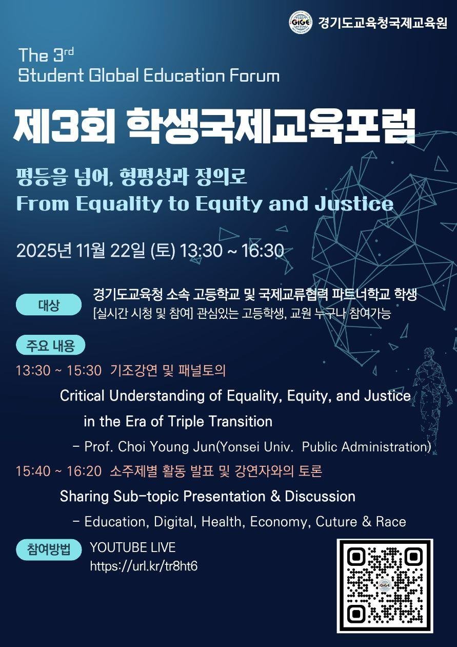 경기도교육청국제교육원 제3회 학생국제교육포럼 통해 학교 간 국제교류의 장 마련 경기도교육청국제교육원 참고자료 경기도교육청 제공 [PEDIEN] 경기도교육청국제교육원이 주관하는 제3회 학생국제교육포럼이 22일 개최되어, 국내외 학생들의 국제교류 활성화를 위한 장이 마련됐다.이번 포럼은 경기도 내 고등학교와 국제교류 활동을 하는 해외 학교 학생들이 함께 참여하는 행사로, 총 11개국 77명의 학생들이 참여했다. 한국 학생 44명과 일본, 뉴질랜드, 미국, 베트남, 필리핀, 대만 등 다양한 국적의 해외 학생 33명이 참여하여 열띤 토론을 벌였다.올해 포럼의 주제는 '평등을 넘어, 형평성과 정의로'이다. 참가 학생들은 교육, 디지털, 건강, 경제, 문화, 인종 형평성 등 다양한 사회 문제에 대한 해결 방안을 모색하고, 협력 프로젝트를 통해 아이디어를 공유했다.포럼은 연세대 최영준 교수의 기조강연으로 시작되었으며, 소주제별 활동 발표와 강연자와의 토론이 이어졌다. 모든 과정은 실시간 쌍방향 원격 프로그램과 유튜브 생중계를 통해 진행되어, 더 많은 학생들이 참여하고 의견을 나눌 수 있도록 했다.박숙열 경기도교육청국제교육원장은 “이번 포럼이 국제교류 활동을 하는 학교 간의 소통과 네트워크를 확대하는 데 기여하고, 학생들의 협력적 문제 해결 능력을 향상시키는 데 중점을 두었다”고 밝혔다. 또한, “앞으로도 다양한 문화적 배경을 가진 학생들이 글로벌 문제에 대한 공감대를 형성하고, 세계 시민으로서의 역량을 키울 수 있는 기회를 지속적으로 마련할 것”이라고 덧붙였다. -