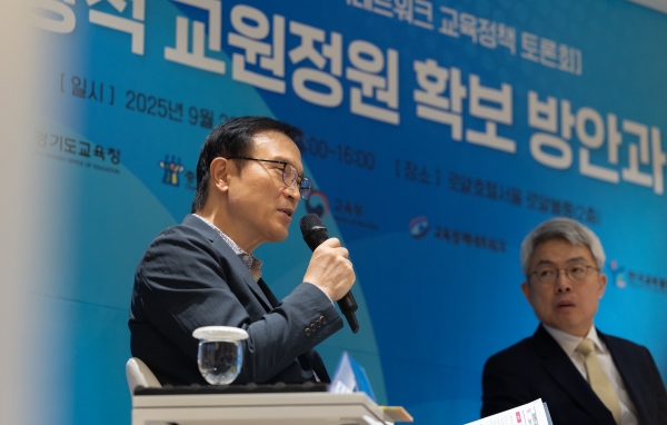 임태희 교육감, “안정적인 교원정원 확보는 대한민국 교육의 미래에 관한 문제” [PEDIEN] 임태희 경기도교육감이 23일 열린 ‘제4회 전국 교육정책 네트워크 교육정책 토론회’ 자리에서 “대한민국 교육의 미래를 위해서는 안정적인 교원정원 확보를 위한 노력과 탄력적이고 유연한 교원정원 제도가 이뤄져야 한다”고 강조했다. 이번 토론회는 경기도교육청, 충청북도교육청, 교육부, 교육정책 네트워크가 공동 주최하고 한국교육개발원이 주관해 이뤄졌다. 토론회에는 임태희 교육감을 비롯해 윤건영 충청북도 교육감, 고영선 한국교육개발원장, 17개 시도교육청 교육정책 기획 및 인사정책 담당자, 교육 관련 연구기관 담당자, 교원 등 100여명이 참석했다. 이날 토론회는 ‘미래지향적인 교원정원 확보 방안과 과제’를 주제로 1부 연구 보고와 2부 대담으로 구성했다. 제1부에서는 △우리나라 교원정원 산정 방식 △우리나라 교원정원에 관한 재정구조에 따른 쟁점과 과제를 중심으로 미래교육 수요에 대응하는 교원정원제도 개편 방안 연구 보고가 이뤄졌다. 제2부에서는 고영선 한국교육개발원장의 진행으로 전국시도교육감협의회 교원정원특별위원회 공동 위원장인 임태희 경기도교육감과 윤건영 충청북도교육감의 대담이 이어졌다. 임태희 교육감은 “지난 3년간 교육 본질을 회복하고 모든 학생의 성장을 위한 경기미래교육을 실천해 왔다”는 소회를 밝히면서 “앞으로도 대입제도 개편, 하이러닝 및 AI 논·서술형 평가시스템 고도화, 경기공유학교와 경기온라인학교를 내실화해 모든 학생의 인성과 역량을 키워 미래를 준비하는데 집중하겠다”고 밝혔다. 이어 “지금은 급격한 사회 변화에 대응해 교육이 새로운 미래교육 체제로의 전환을 준비해야 하는 시기”며 “단순히 학령인구 숫자에 주목하는 관점을 탈피해 AI 교육, 다문화 교육, 특수교육, 돌봄, 기초학력 보장, 고교학점제, 개별 맞춤 교육 등의 새로운 교육수요 대응을 위한 탄력적이고 안정적인 중장기 교원 수급 계획을 설계해야 한다”고 강조했다. 임 교육감은 “교원정원 관련 법령과 제도를 개선하고 시도교육청· 중앙정부·국회 등의 긴밀한 협력이 필수적”이며 “교육은 국가 발전의 근본으로서 안정적인 교원정원의 확보는 대한민국 미래에 대한 중요한 투자”며 교원 확보의 중요성을 거듭 강조했다. -