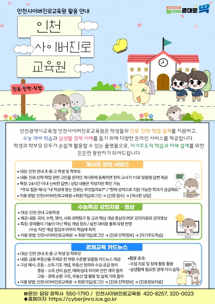 인천광역시교육청, 맞춤형 교육 콘텐츠로 학생 미래 설계 지원 확대 [PEDIEN] 인천광역시교육청은 학생들의 미래 설계를 지원하기 위해 인천사이버진로교육원에 신규 맞춤형 콘텐츠를 추가 탑재했다. 이번에 추가된 콘텐츠는 △경제교육 카드뉴스 △2026학년도 수능특강 강의자료·영상 등이다. 초·중·고 학생 눈높이에 맞춰 금융·부동산 핵심 개념을 시각 자료로 설명하는 경제교육 카드뉴스 콘텐츠와 교과별 핵심 개념 중심으로 국어, 수학, 영어, 탐구 과목의 강의자료와 영상을 제공하는 수능특강 자료로 구성됐다. 또한 학생과 학부모가 질문을 남기면 진로·진학 상담 교사가 24시간 내 1:1 답변을 제공하는 게시판 상담 서비스도 상시 운영 중이다. 인천시교육청 관계자는 “이번 신규 콘텐츠는 경제 소양부터 대입 준비까지 학생들의 다양한 요구를 반영했다”며 “교육원 자료를 적극 활용해 자신감 있게 미래를 준비하길 바란다”고 말했다. -