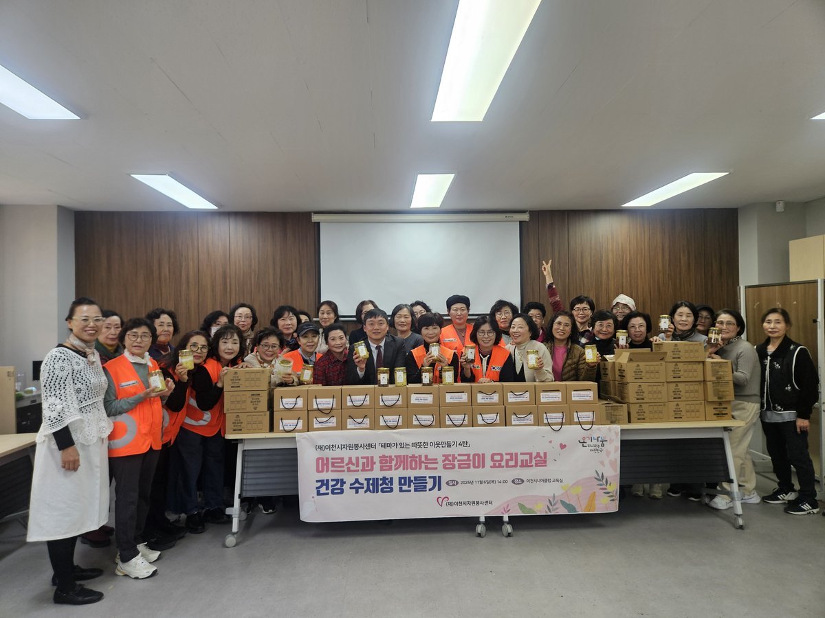 이천시자원봉사센터 어르신들과 함께하는 건강 수제청 만들기 프로그램 진행 [PEDIEN] 이천시자원봉사센터는 11월 6일 이천시니어클럽 교육실에서 ‘테마가 있는 따뜻한 이웃 만들기’프로그램의 일환으로 어르신들과 함께하는 장금이 요리교실 ‘건강 수제청 만들기’활동을 진행했다.이번 활동에는 이천시니어클럽 어르신 25명과 자원봉사자 10명 등 총 35명이 참여해, 꿀로 만든 생강청과 대추청 각 50세트, 총 100세트를 직접 담갔다.특히 자원봉사자 할인가맹점인 최애담 카페 최강민 대표의 재능기부로 이루어져 더욱 의미 있는 시간을 만들었다.‘테마가 있는 따뜻한 이웃 만들기’사업은 이웃 간의 소중한 관계를 되새기며 따뜻한 사회를 만들자는 취지로 진행되고 있으며 이번 수제청은 어르신들의 건강한 겨울나기를 기원하는 마음을 담아 숙성 후 12월에 전달될 예정이다.이미선 센터장은 “어르신들이 직접 만든 수제청으로 건강하고 따뜻한 겨울을 보내시길 바라며 앞으로도 다양한 계층이 참여하는 따뜻한 프로그램을 지속적으로 지원하겠다”고 말했다.한편 이천시자원봉사센터는 연말에도 겨울 테마 프로그램을 기획해 소외된 이웃 없이 모두가 따뜻한 겨울을 보낼 수 있도록 다양한 나눔 활동을 이어갈 계획이다. -
