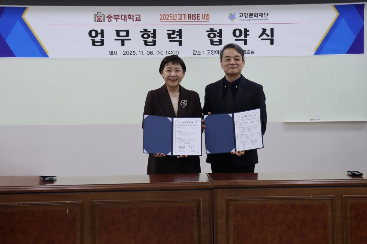 중부대학교와 RISE 사업 협력 업무협약 체결 (고양시 제공) [PEDIEN] 고양문화재단이 중부대학교 경기RISE사업단과 손을 잡고 지역 상생을 위한 협력에 나선다.양 기관은 지난 6일 고양어울림누리에서 RISE 사업의 성공적인 추진을 위한 업무협약을 체결했다고 밝혔다.RISE 사업은 대학, 지자체, 기업, 연구기관이 협력하여 지역 혁신 생태계를 구축하고 대학과 지역사회의 동반 성장을 목표로 하는 국가 지원 프로젝트다. 중부대학교는 2025년 경기도 RISE 지원사업에 선정된 바 있다.이번 협약을 통해 양 기관은 콘텐츠 개발, 기술 자문, 교육 및 현장 실습 등 다양한 분야에서 협력한다. RISE 사업 관련 프로그램, 행사, 과제 협업 등 인적, 물적 자원 연계를 통해 지역 상생과 미래 인재 양성에 힘쓸 계획이다.남현 고양문화재단 대표이사는 중부대학교와의 지속적인 협력 관계를 강조하며, 이번 협약을 통해 교육과 문화 현장 연계, 지역 인재 양성, 지역 혁신 클러스터 연계 등에서 실질적인 성과를 창출할 수 있을 것으로 기대한다고 밝혔다. 또한, 지역 문화 거버넌스를 강화하겠다는 의지를 표명했다.전미옥 중부대학교 경기RISE사업단장은 고양문화재단을 창의적 인재 양성의 든든한 파트너라고 칭하며, 이번 협약을 통해 대학의 교육 역량과 재단의 문화 콘텐츠 경험이 결합되어 교육, 문화, 산업이 연결되는 실감형 지역 혁신 모델을 구현하겠다고 말했다.RISE 사업의 핵심 가치인 지역 동반 성장을 강조하며, 학생들이 현장에서 배우고 지역이 대학을 통해 성장하는 상생의 선순환 구조를 구축하겠다고 덧붙였다.이번 협약은 교육과 현장 연계를 강화하여 미래 인재 양성과 지역 정주 생태계 조성에 크게 기여할 것으로 전망된다. -