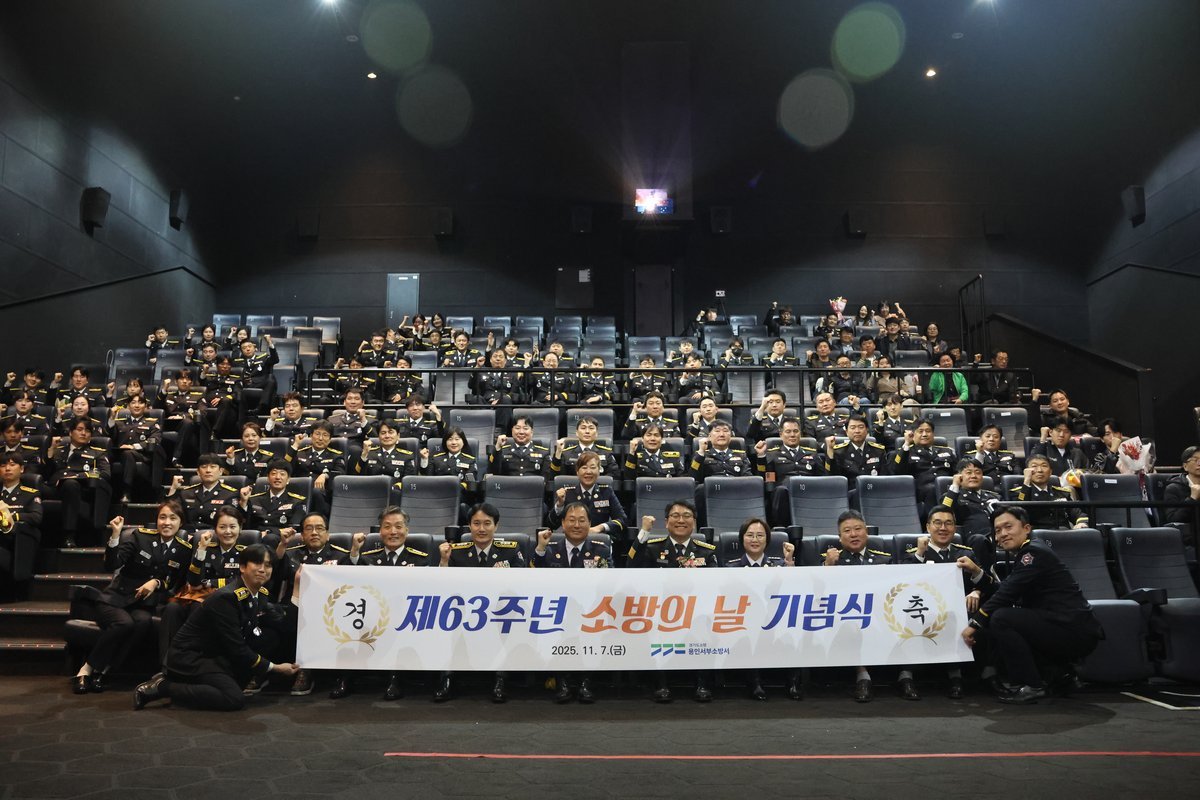 단체사진 (사진제공=용인소방서) [PEDIEN] 용인서부소방서가 7일 롯데시네마 기흥점에서 제63주년 소방의 날 기념식을 개최했다.이번 기념식은 소방공무원의 숭고한 사명 정신을 되새기고 재난 대응 전문 기관으로서의 자긍심과 사기를 높이기 위해 마련됐다.기념식에는 의용소방대 연합회 임원, 표창 수상자, 소방공무원 등 130여명이 참석해 자리를 빛냈다.행사는 국민의례를 시작으로 유공자 표창, 기념사 및 축사 순으로 진행됐다.김중양 용인서부소방서장을 비롯한 참석자들은 시민의 안전을 위해 더욱 헌신할 것을 다짐했다.이날 기념식에서는 총 46명이 소방청장, 경기도지사, 용인특례시장 등으로부터 표창을 받았다.이들은 평소 화재 진압과 구조 활동에 헌신적으로 참여해 시민의 안전을 지키는 데 기여한 공로를 인정받았다.김중양 용인서부소방서장은 “모든 직원이 재난 현장의 최일선에서 시민의 생명을 지킨다는 사명감을 가지고 헌신하고 있다”며 “앞으로도 안전한 용인을 만들기 위해 더욱 노력하겠다”고 밝혔다.용인서부소방서는 앞으로도 시민의 안전을 최우선으로 생각하며 화재 예방과 재난 대응에 최선을 다할 계획이다. -