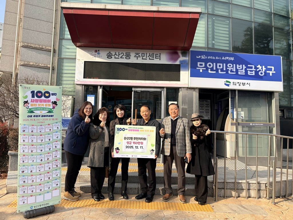 송산2동 송산2동 주민자치회 100일간 사랑릴레이 성금 150만 원 기탁 [PEDIEN] 의정부시 송산2동주민센터는 12월 17일 송산2동 주민자치회가 관내 취약계층 지원을 위해 성금 150만 원을 기탁했다고 밝혔다.이번 성금은 송산2동 주민자치회가 지역사회 나눔 활동에 동참하고자 마련했다. 문화예술분과·복지교육분과·마을환경분과에서 각각 20만 원씩 총 60만 원을 모금했으며, 박상갑 회장을 비롯한 임원진이 추가로 기부해 총 150만 원의 성금이 조성됐다.박상갑 회장은 “주민자치회가 지역사회에 기여할 수 있는 역할을 고민하는 과정에서 100일간 사랑릴레이에 동참하게 됐다”며 “앞으로도 이웃을 위한 나눔과 사회적 책임을 지속적으로 실천해 나가겠다”고 전했다.황보경 동장은 “주민자치회가 지역사회를 위한 뜻깊은 나눔에 함께해 주셔서 감사드린다”며 “전달된 성금은 도움이 필요한 관내 취약계층을 위해 투명하고 책임감 있게 활용하겠다”고 말했다. -