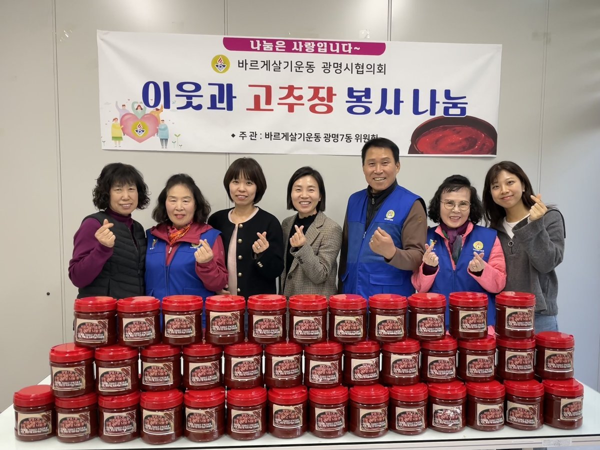바르게살기위원회 따뜻한 마음 담은 수제 고추장 전달 (광명시 제공) [PEDIEN] 광명시 광명7동 바르게살기위원회가 직접 담근 수제 고추장을 저소득층과 한부모가정 50가구에 전달하며 따뜻한 온정을 나눴다.추운 겨울, 어려운 이웃들에게 따뜻한 마음을 전하고자 마련된 이번 행사는 광명7동 바르게살기위원회의 꾸준한 나눔 활동의 일환이다.박희준 위원장은 “매년 이어온 고추장 나눔이 이웃들에게 작은 위로가 되기를 바란다”며 “주민들의 정성이 모여 더욱 따뜻한 광명7동이 되기를 희망한다”고 밝혔다.김미정 동장은 바르게살기위원회의 따뜻한 나눔에 감사를 표하며 “이웃들의 겨울이 한층 따뜻해질 것 같다”고 말했다.이어 “기부의 온정이 어려운 가정에 잘 전달될 수 있도록 최선을 다하겠다”고 덧붙였다.광명7동 바르게살기위원회는 매년 겨울, 관내 취약계층을 위한 수제 고추장 전달을 통해 나눔 문화 확산과 이웃 사랑 실천에 앞장서고 있다.이들의 따뜻한 마음이 지역 사회에 훈훈한 온기를 불어넣고 있다.