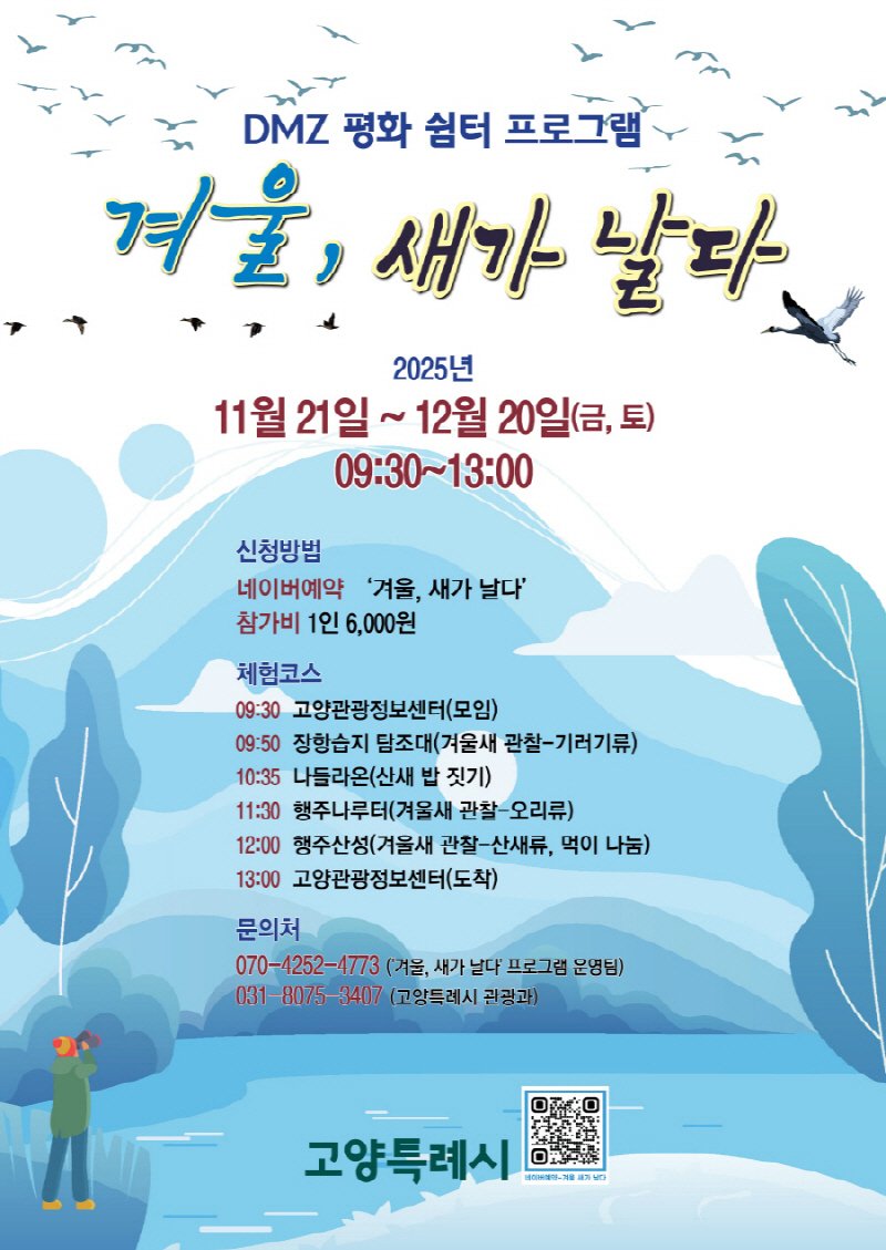 고양시_철새와_함께하는_겨울_새가_날다_프로그램_운영 (사진제공=고양시) [PEDIEN] 고양시가 겨울철 람사르 장항습지를 찾는 철새를 주제로 특별 프로그램을 운영한다.'겨울, 새가 날다'프로그램은 오는 21일부터 다음 달 20일까지 DMZ 평화의 길 쉼터에서 진행되며 참가자들에게 자연과 교감하며 평화의 가치를 되새기는 기회를 제공한다.매주 금요일과 토요일에 운영되는 이번 프로그램은 장항습지탐조대에서 겨울 철새를 직접 관찰하는 시간을 갖는다.참가자들은 새 밥 짓기 체험활동을 통해 철새의 생태를 이해하고 철책길을 걸으며 DMZ 접경지역의 역사적 의미와 생태적 중요성을 되새기게 된다.특히 DMZ 평화의 길 쉼터 탐방은 참가자들에게 특별한 경험을 선사할 것으로 기대된다.프로그램 참가를 희망하는 시민은 6일부터 네이버 예약사이트를 통해 신청할 수 있으며 선착순으로 모집한다.고양시 관계자는 이번 프로그램이 가족 단위 참가자뿐 아니라 자연에 관심 있는 모든 이들에게 특별한 경험을 제공할 것이라고 밝혔다.그는 특별한 환경 속에서 철새를 관찰하고 소통하며 더욱 깊이 있는 경험을 누리기를 바란다고 덧붙였다. -