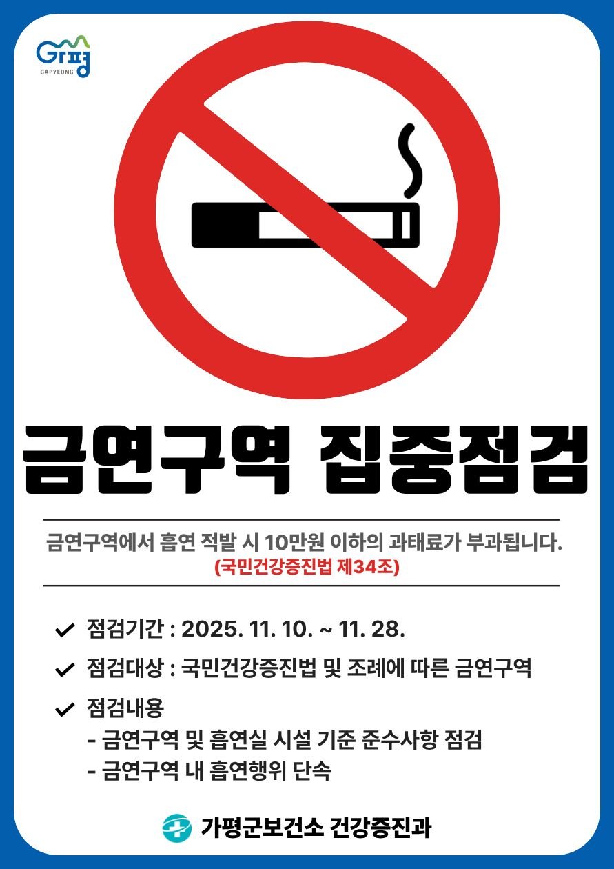 가평군 공중이용시설 등 금연구역 집중 점검 [PEDIEN] 가평군 보건소가 11월 10일부터 28일까지 관내 금연구역에 대한 집중 점검을 실시한다.이번 점검은 국민건강증진법 및 관련 조례에 따른 것으로 흡연 민원이 잦은 지역과 공공청사, 의료시설, 학교, 어린이집 등 금연 환경 조성이 필요한 시설을 중심으로 진행된다.보건소는 금연구역 안내 표지 부착 여부, 흡연실 기준 준수 여부, 금연구역 내 흡연 행위 등을 철저히 점검할 계획이다.특히 개정된 국민건강증진법에 따라 학교, 유치원, 어린이집 경계 30m 이내 구역과 대안교육기관이 새롭게 금연구역으로 지정된 점을 적극 홍보할 예정이다.장우진 가평군보건소장은 “다수가 이용하는 공중이용시설에서 간접흡연 피해를 예방하는 것이 중요하다”며 금연 문화 정착을 위해 군민들의 동참을 당부했다.가평군은 이번 집중 점검을 통해 군민들의 건강을 보호하고 쾌적한 환경을 조성하는 데 기여할 것으로 기대하고 있다. -