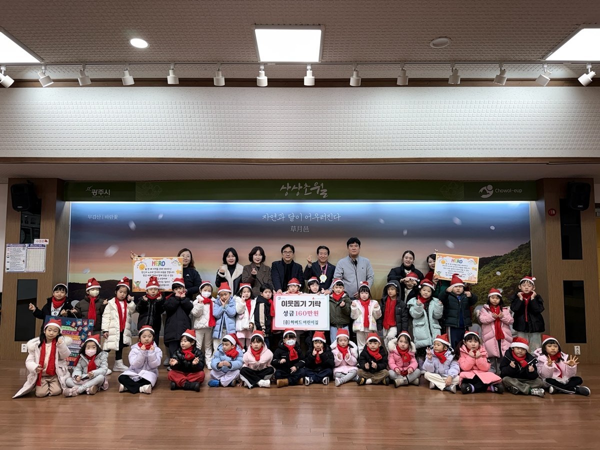 하버드어린이집 원아 야시장 수익금 160만 원 광주시 초월읍에 기탁 광주시 제공 [PEDIEN] 광주시 초월읍에 위치한 하버드어린이집 원아들이 직접 마련한 야시장 수익금 160만원이 초월읍에 전달됐다.지난 17일, 하버드어린이집은 원아들이 원내 야시장을 통해 얻은 수익금을 경기 사회복지공동모금회를 통해 초월읍에 기탁하며 따뜻한 마음을 전했다. 이번 기탁은 아이들과 함께 나눔의 의미를 되새기고 실천하고자 마련됐다.기탁식에는 원아들과 남미선 원장, 교사 등 40여명이 참석하여 나눔의 참된 의미를 되새기는 시간을 가졌다. 아이들은 자신들이 직접 참여하여 얻은 수익금이 어려운 이웃을 돕는 데 쓰인다는 사실에 큰 기쁨을 느꼈다.남미선 원장은 “아이들이 직접 참여해 마련한 성금이라 더욱 의미가 깊다”며, “앞으로도 아이들과 함께 나눔을 실천하는 교육을 지속적으로 이어나갈 계획”이라고 밝혔다.이학순 읍장은 “아이들의 작은 손으로 모은 소중한 성금에 깊이 감사드린다”며, “기탁받은 성금은 초월읍 내 도움이 필요한 이웃들을 위해 소중하게 사용하겠다”고 전했다. 하버드어린이집의 따뜻한 나눔은 지역사회에 훈훈한 감동을 선사하고 있다.
