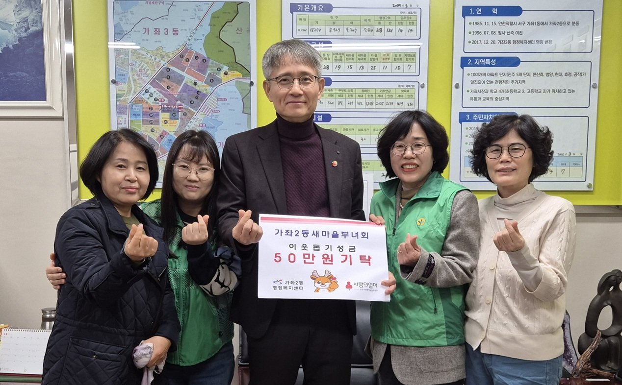 가좌2동 새마을부녀회 사랑의 성금 50만원 기탁 (인천서구 제공) [PEDIEN] 인천 서구 가좌2동 새마을부녀회가 지난 5일, 관내 어려운 이웃을 돕기 위해 써달라며 가좌2동 행정복지센터에 성금 50만원을 전달했다.이번 성금은 새마을부녀회 회원들이 연말을 맞아 십시일반 정성을 모아 마련한 것으로 알려졌다.부녀회장은 어려운 이웃들이 따뜻하고 건강하게 겨울을 보내기를 바라는 마음에서 회원들과 함께 성금을 준비했으며, 앞으로도 가좌2동에 도움이 되는 일에 적극적으로 참여하겠다고 밝혔다.박송배 가좌2동장은 새마을부녀회에 감사를 표하며, 기탁된 성금은 지역사회보장협의체 사업을 통해 관내 취약계층에게 소중히 전달될 예정이라고 전했다.이번 새마을부녀회의 따뜻한 나눔은 어려운 이웃들에게 희망을 전달하고, 지역사회에 훈훈한 온정을 불어넣을 것으로 기대된다. -