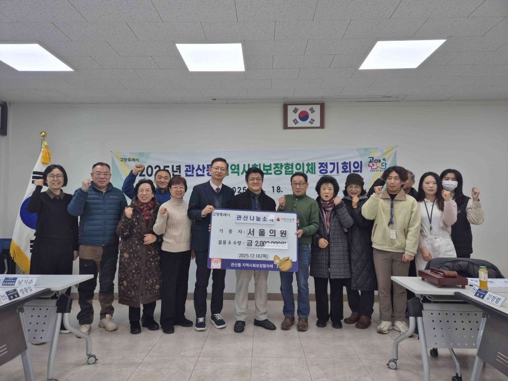 고양시 관산동, 서울의원에서 연말맞이 성금 200만 원 기부 (고양시 제공) [PEDIEN] 고양시 덕양구 관산동에 위치한 서울의원이 연말을 맞아 어려운 이웃을 위해 써달라며 성금 200만원을 기탁했다.서울의원의 이번 기부는 지역사회 일원으로서 사회적 책임을 다하고, 소외된 이웃들에게 희망을 전달하고자 하는 마음에서 비롯됐다.서울의원 관계자는 “작은 정성이지만 어려운 이웃들에게 위로와 희망이 되기를 바란다”며, “앞으로도 지역사회와 함께하는 다양한 나눔 활동을 꾸준히 이어갈 것”이라고 밝혔다.남기준 관산동장은 “서울의원의 따뜻한 기부는 지역사회에 나눔 문화를 확산시키는 데 큰 힘이 된다”며 감사의 뜻을 전했다. 그는 또한 “기탁된 성금은 관내 취약계층 지원을 위해 소중하게 사용될 예정”이라고 덧붙였다.한편, 관산동에서는 연말을 맞아 서울의원의 성금 기탁 외에도 어려운 이웃을 돕기 위한 따뜻한 손길이 이어지고 있다. 이러한 나눔의 물결은 추운 겨울, 지역사회에 훈훈함을 더하고 있다. -