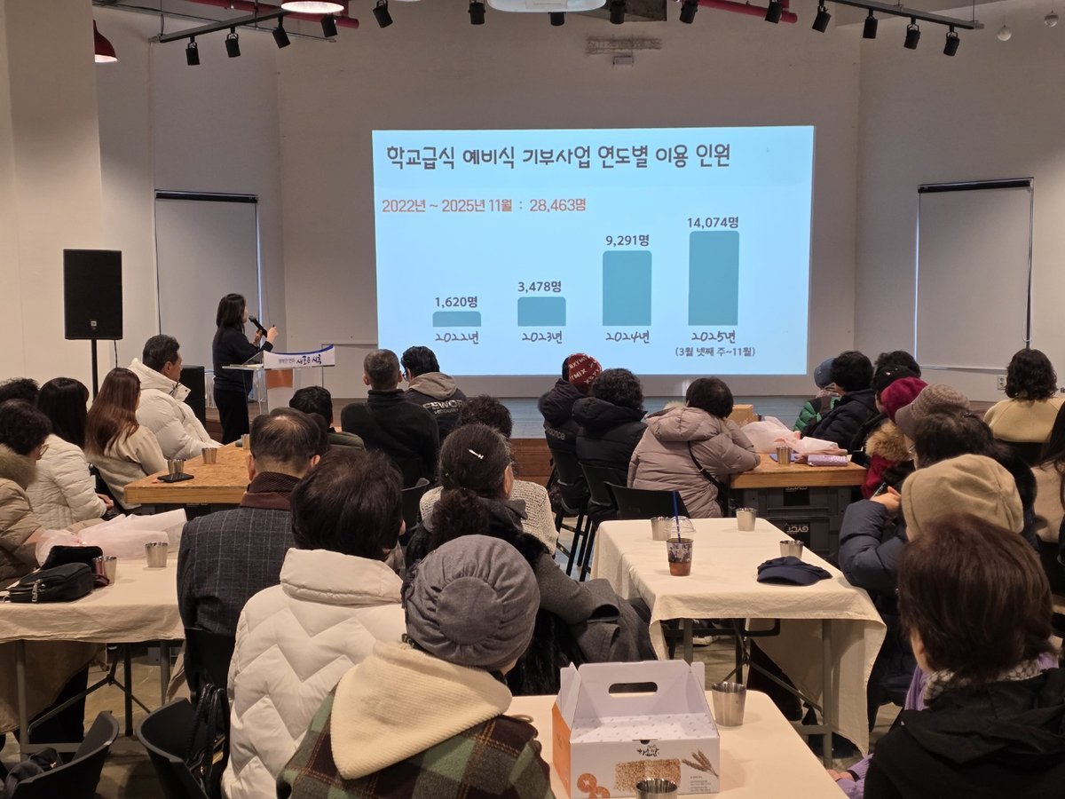 학교급식 예비식 기부사업 연말 간담회 현장 [PEDIEN] 시흥시학교급식지원센터는 지난 12월 15일 청년협업마을 가치관 다목적홀에서 ‘2025년 학교급식 예비식 기부사업 연말 간담회’를 열고 한 해 동안의 성과를 공유했다.이날 간담회에는 시흥시농업기술센터, 시흥시교육지원청, 학교급식지원센터 관계자를 비롯해 예비식 기부사업에 참여한 학교의 영양사, 복지기관 실무자, 자원봉사자, 배송 담당자 등 70여 명이 참석했다.행사는 올해 활동을 담은 영상 상영을 시작으로 예비식 기부사업 성과 발표, 참여 기관과 실무자들의 사례 발표, 향후 발전 방향 논의 순으로 진행됐다. 참석자들은 사업 운영 과정에서의 경험과 개선점을 공유하며 지속 가능한 먹거리 나눔 체계 구축을 위한 의견을 나눴다.학교급식 예비식 기부사업은 학교급식 배식에 사용되지 않은 깨끗한 음식을 활용해 지역 내 먹거리 취약계층에 도시락 형태로 제공하는 사업이다.올해 4월부터 11월까지 총 340회에 걸쳐 1만 4천여 명에게 먹거리를 제공하며 음식물쓰레기 감축과 지역 먹거리 복지 향상에 크게 이바지했다.이미경 센터장은 “2022년 5개 학교와 1개 복지기관으로 시작한 예비식 기부사업이 2025년에는 24개 학교와 6개 복지기관으로 확대됐다”라며, “2026년에도 지속가능한 먹거리 나눔 체계를 구축할 수 있도록 노력하겠다”라고 밝혔다.김익겸 시흥시 농업기술센터소장은 "학교급식 예비식 기부사업에 함께한다는 것이 쉽지 않은 일임을 안다”라며 “시흥시민 누구나 건강한 식사를 보장받을 수 있도록 힘써주시는 많은 분에게 감사드린다”라고 말했다. -