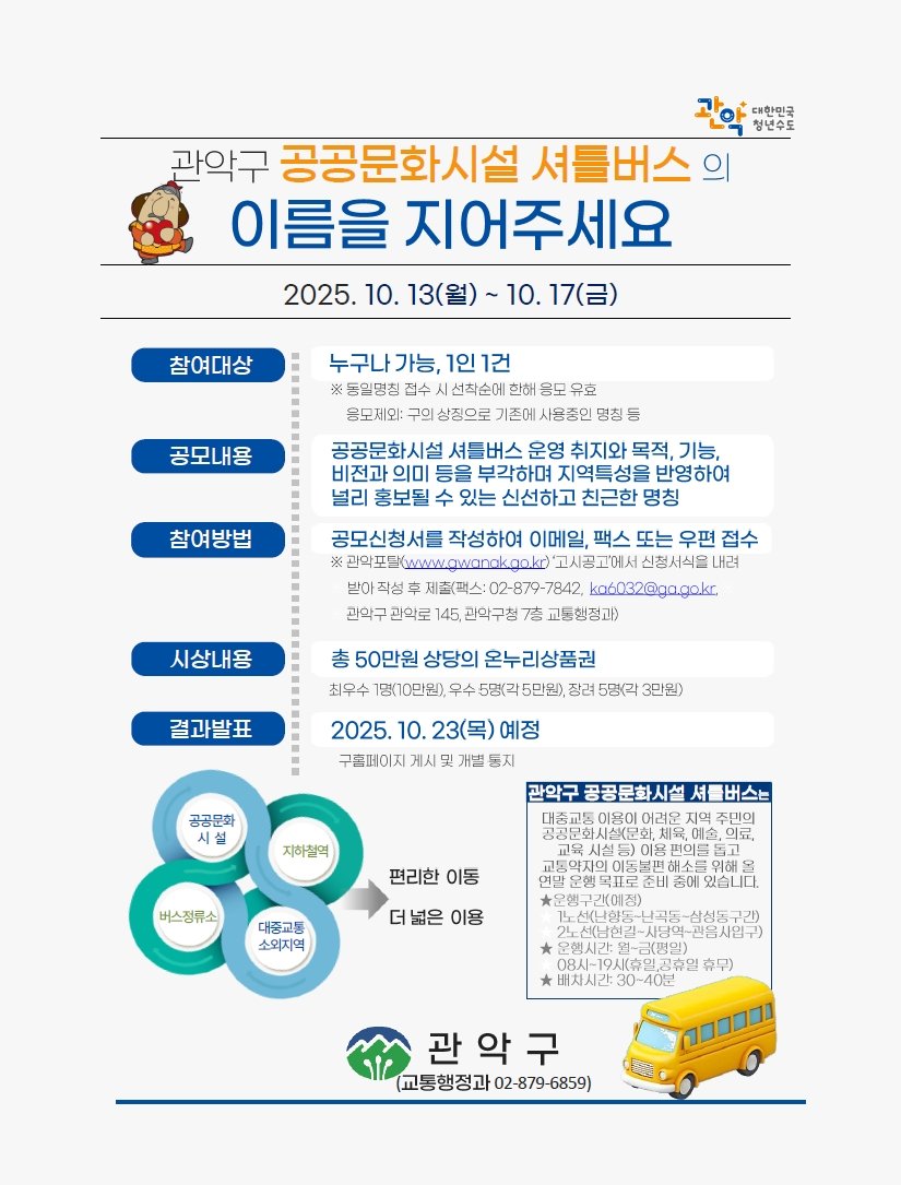 관악구 공공문화시설 셔틀버스 명칭 공모전 홍보 포스터 (사진제공=관악구) [PEDIEN] 관악구가 대중교통 이용이 어려운 고지대 주민들의 이동 편의를 획기적으로 개선하기 위해 '공공문화시설 셔틀버스'를 도입한다. 오는 12월 시범 운영을 시작하며, 지형적 특성으로 인해 교통 소외를 겪던 주민들의 공공시설 접근성이 크게 높아질 전망이다.구는 난향동 일대(난향동~난곡동~삼성동)와 남현길 일대(남현길~사당역~관음사 입구) 두 곳에 셔틀버스를 투입한다. 이 지역들은 고지대에 위치해 시내버스나 마을버스 노선이 닿지 않아 어르신, 장애인 등 교통약자의 이동에 큰 불편이 따랐던 곳이다.셔틀버스 노선에는 공원, 복지관, 보건분소, 파크골프장, 시립 남서울미술관 등 관내 주요 공공 및 문화시설이 포함된다. 구 관계자는 교통약자가 관내 시설을 편리하게 접근하고 이용하는 데 중점을 뒀다고 셔틀버스 운영 취지를 설명했다.이번 셔틀버스 도입은 오랜 준비 과정을 거쳤다. 구는 지난 3월 대중교통 불편 지역에 대한 실태조사를 완료하고, '공공문화시설 등 셔틀버스 운영 조례'를 제정하며 제도적 기반을 마련했다. 이후 최적 노선을 분석하고 9월 추가경정예산을 편성해 필요한 재원을 확보했다.구는 지난달 29일과 30일 남현동과 난곡동 주민센터에서 주민설명회를 개최해 노선안과 운영 일정을 안내하고 주민 의견을 수렴하는 시간을 가졌다. 현재는 오는 17일까지 셔틀버스의 목적과 비전을 담은 명칭을 공모하는 중이다.수렴된 주민 의견은 노선조정심사위원회의 심의를 거쳐 최종 운행안에 반영된다. 구는 12월 시범 운행을 통해 노선과 운영 지역을 보완한 뒤, 내년 1월에 정식 개통할 방침이다.박준희 관악구청장은 “관악구는 지형 특성상 고지대가 많아 이동 수단이 곧 삶의 질과 직결된다”며 “공공문화시설 셔틀버스 운행이 주민 행복감과 만족도에 크게 기여할 것으로 기대한다. 주민 누구나 자유롭게 관악구의 교통 복지를 누릴 수 있도록 모든 행정력을 집중하겠다”고 밝혔다. -