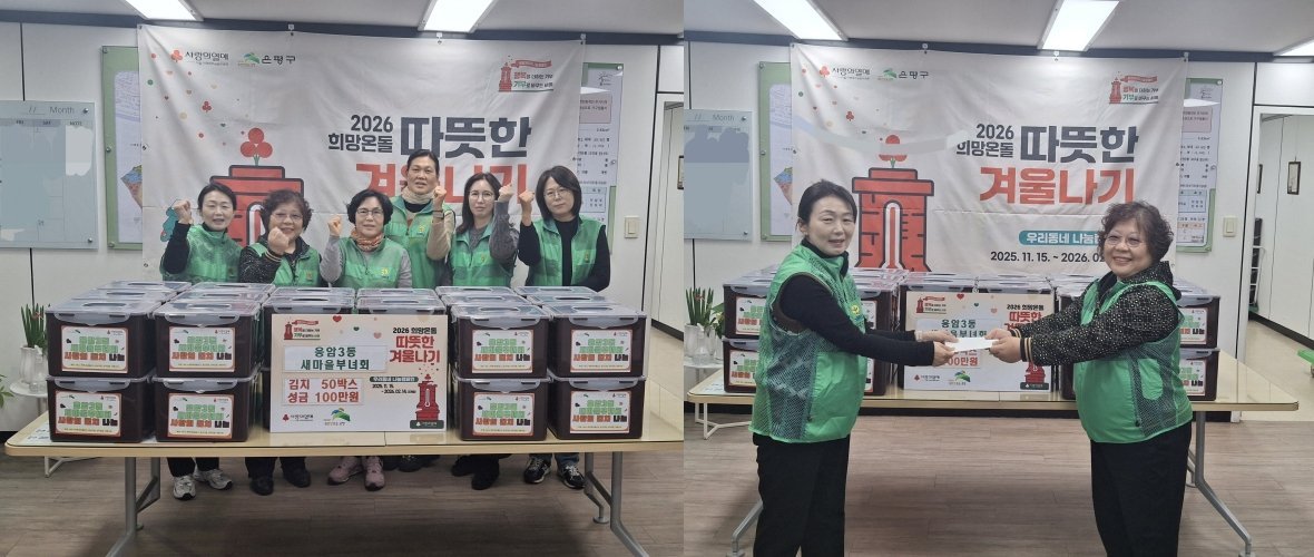 응암3동, 새마을부녀회와 사랑의 김장 나눔 행사 및 이웃돕기 성금 기탁 (은평구 제공) [PEDIEN] 서울 은평구 응암3동은 지난달 27일 새마을부녀회와 지역 내 저소득 가구와 어르신 등 소외된 이웃들에게 전달할 ‘사랑의 김장 나눔 행사’를 진행했다고 밝혔다.이번 행사는 새마을부녀회가 주관했으며, 쌀쌀해진 날씨에도 불구하고 이른 아침부터 많은 회원들이 모여 26일과 27일 이틀간 정성스레 김장 김치를 담갔다.또한, 회원들은 어려운 이웃을 위한 마음을 담아 십시일반 마련한 성금 1백만 원을 기부했다.이날 기탁된 성금은 지역 내 취약계층에 전달할 예정이다.김재복 새마을부녀회장은 "작은 손길이지만 받는 분들께 힘이 되고 응암3동 전체에 따뜻한 온기가 전해지길 바란다"고 말했다.김영숙 응암3동장은 "추운 날씨에도 지역사회를 위해 힘을 보태주신 새마을부녀회 회원들께 진심으로 감사드린다"며 “앞으로도 지속적인 봉사와 나눔을 통해 주변에 선한 영향력 펼쳐주시기를 바란다”고 밝혔다. -