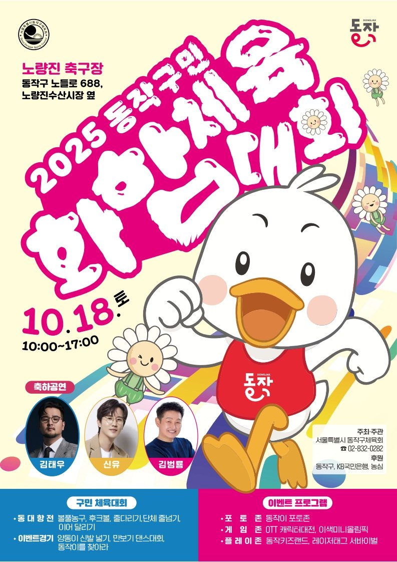‘2025 동작구민 화합 체육대회’ 홍보 포스터 [PEDIEN] 동작구가 오는 18일 노량진축구장에서 5천여 명의 구민이 참여하는 '2025 동작구민 화합 체육대회'를 개최한다. 이번 행사는 구민의 건강 증진과 이웃 간 소통을 강화하기 위해 마련됐으며, 동 대항 경기부터 다채로운 체험 프로그램까지 풍성하게 구성됐다. 동작구체육회가 주최·주관하는 이번 대회는 오전 10시 동작구 어린이·청소년 태권도시범단의 식전 공연을 시작으로 막을 올린다. 개회식 이후 11시부터 본격적인 체육대회가 진행되며, 선수단과 응원단을 포함해 총 5천여 명의 주민이 참여할 예정이다. 특히 올해는 경기 종목을 확대하고 동 대항 경기와 이벤트 경기를 교차 운영하여 참여도를 높이는 데 중점을 뒀다. 동별 선수단이 경쟁하는 '동 대항 경기'는 볼풀농구, 후크볼, 줄다리기, 단체줄넘기, 이어달리기 등 총 5종목으로 구성됐으며, 경기 종료 후 바로 시상이 진행된다. 경쟁을 넘어 주민 누구나 즐길 수 있는 이벤트 경기와 체험 공간도 마련된다. 이벤트 경기로는 양동이에 신발 넣기, 만보기 댄스, 보물찾기(동작이를 찾아라) 등이 준비됐다. 아울러 행사장 곳곳에는 미니 범퍼카, 에어바운스, 레이저 서바이벌 등을 즐길 수 있는 플레이존과 게임존, 포토존이 운영된다. 체육대회의 열기는 오후 3시부터 시작되는 축하공연으로 이어진다. 초청 가수 김태우, 신유, 김범룡과 전자현악 퍼포먼스팀이 무대에 올라 축제 분위기를 고조시킬 전망이다. 공연 후 시상식과 폐회식을 끝으로 대회가 마무리된다. 구는 안전한 대회 운영을 위해 행사 당일 합동상황실을 설치하고 안전관리요원을 배치할 계획이라고 밝혔다. 박일하 동작구청장은 “이번 체육대회가 구민 모두에게 화합과 소통의 장이 되기를 기대한다”며 “앞으로도 구민이 함께 즐길 수 있는 프로그램을 지속적으로 발굴하겠다”고 강조했다. -