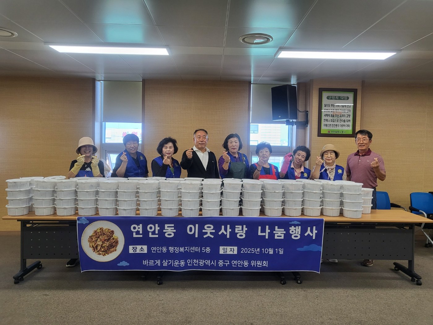 6-1 보도사진 (바르게살기운동 연안동 위원회 이웃사랑 반찬 나눔) (사진제공=연안동) [PEDIEN] 바르게살기운동 인천 중구 연안동 위원회가 추석 명절을 앞두고 지역 내 소외된 이웃 150여 명에게 정성껏 준비한 반찬을 전달하며 따뜻한 온정을 나눴다. 위원회는 지난 1일 '이웃사랑 반찬 나눔' 행사를 진행하고, 명절을 맞아 소외감을 느낄 수 있는 관내 취약계층에 희망과 위로를 전하는 데 집중했다. 이번 봉사활동을 위해 연안동 위원회 회원들은 이른 아침부터 모여 직접 반찬을 준비하는 데 힘썼다. 특히 이들은 신선한 채소와 함께 양념된 소불고기를 정성껏 조리하고 개별 포장하는 작업을 진행했다. 준비된 소불고기 반찬은 경로당과 연안지역아동센터, 그리고 관내 취약계층 150여 명에게 직접 전달됐다. 이는 명절 기간 동안 경제적 어려움으로 식사 준비가 쉽지 않은 이웃들에게 실질적인 도움을 제공하기 위함이다. 안준림 위원장은 “소외된 이웃들을 위한 봉사는 언제나 큰 보람을 준다”며 “형편이 어려운 분들에게 작은 힘이라도 되기를 바란다”고 소감을 밝혔다. 김정미 여성위원장은 “더 많은 도움을 드리지 못해 아쉬움이 남지만, 봉사 때마다 적극적으로 참여해주는 회원들에게 깊이 감사하다”고 전했다. -