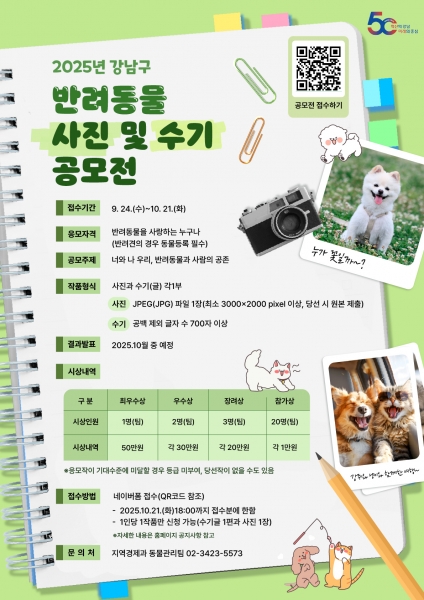 강남구, 반려동물 사진·수기 공모전 개최 [PEDIEN] 꿈이 모이는 도시, 미래를 그리는 강남구가 오는 9월 24일부터 10월 21일까지 ‘반려동물 사진 및 수기 공모전’을 개최한다. 이번 공모전은 반려동물과 함께한 일상을 기록한 사진과 수기를 접수받아 총상금 190만원 규모로 시상할 예정이다. 공모 주제는 ‘너와 나 우리, 반려동물과 사람의 공존’ 이다. 단순한 반려동물 자랑이 아니라, 반려동물이 가족과 이웃, 지역사회 속에서 어떤 의미를 지니는지 돌아보고 이를 공유하는 데 의의가 있다. 참가는 주소지와 관계없이 누구나 가능하다. 구청 홈페이지 공지사항이나 홍보 포스터의 QR코드를 통해 접속한 뒤, 네이버폼으로 작품을 제출하면 된다. 출품작은 흑백 또는 컬러 사진 1장과 700자 이상의 수기 1편으로 1인 1작품만 응모할 수 있다. 심사는 작품의 우수성·독창성·활용 가능성 등을 기준으로 진행되며 10월 중 △최우수상 1명 △우수상 2명 △장려상 3명 △참가상 20명 등 총 26명에게 총상금 190만원이 수여된다. 수상작은 오는 11월 전시회를 통해 일반에 공개될 예정이다. 조성명 강남구청장은 “이번 공모전이 반려동물과 반려인이 함께한 일상을 공유하는 소통의 장이 되길 바란다”며 “이를 계기로 반려동물에 대한 인식을 개선하고 사람과 동물이 공존하는 성숙한 문화가 확산되길 기대한다”고 말했다. -