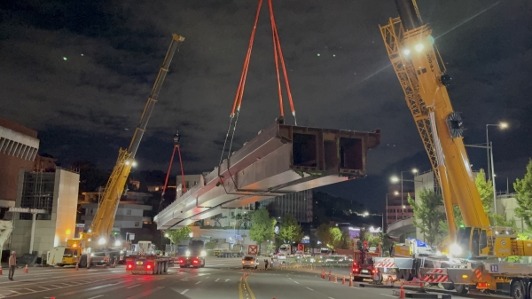 안전한 길, 열린 하늘. 북한남삼거리 보도육교 철거 [PEDIEN] 서울 용산구는 지난 9월 20일 밤부터 21일 새벽까지 진행된 한남동 북한남삼거리 보도육교 본선 상부 철거 작업이 계획대로 순조롭게 완료됐다고 밝혔다. 이번 공정은 전체 철거 일정 가운데 가장 중요한 단계로 차량 통행이 많은 한남대로 상부 구조물을 안전하게 해체함으로써 사업이 본격화되는 계기가 됐다. 보도육교 철거는 9월 15일부터 27일까지 총 14일간 진행된다. 특히 20~21일 야간 집중 작업에는 구조기술자, 장비 운전자, 신호수, 산소공 등 약 50여명의 인력과 300t·250t·50t급 대형 크레인 3대, 트레일러 등 중장비 18대가 투입됐다. 작업은 사전 준비 6일을 거쳐 20일 밤 10시부터 익일 오전 8시까지 약 10시간 동안 이뤄졌다. 절단·인양·운반 등 전 과정이 안전하게 마무리됐으며 공사 중 도로는 부분 통제와 13분간의 전면 통제가 있었으나, 경찰 및 교통 통제 인력 배치로 교통 혼잡이나 안전사고 없이 작업이 종료됐다. 북한남삼거리 보도육교는 오랫동안 한남대로를 횡단하는 주요 보행 시설로 활용돼 왔으나, 구조물의 노후화와 안전성 문제로 철거 필요성이 제기돼 왔다. 이에 구는 정밀안전진단, 행정안전부·서울시·경찰청 등 관계 기관 협의, 주민 여론조사 등을 거쳐 철거를 최종 확정했다. 철거 이후에는 보행자 안전 확보를 위해 기존 횡단보도에 교통섬을 설치할 예정이다. 박희영 용산구청장은 “가장 까다로운 상부 철거 공정을 무사히 마쳐 후속 작업도 차질 없이 진행될 수 있게 됐다”며 “이번 철거가 주민 불안을 해소하고 안전한 보행 환경을 조성하는 계기가 되길 바란다”고 말했다. 이어 “남은 공정도 안전하게 마무리해 쾌적한 한남대로와 남산 조망권 회복을 실현하겠다”고 덧붙였다. 한편 구는 지난 1월 31일 해당 육교에 대한 정밀안전진단 용역을 발주했으며 3월 9일에는 북한남삼거리 남측부에 폭 8m, 길이 46m의 임시 횡단보도를 설치한 바 있다. -