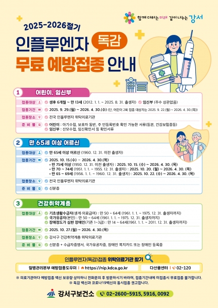 강서구, 인플루엔자 백신 무료 예방접종.내년 4월 30일까지강서구, 인플루엔자 백신 무료 예방접종.내년 4월 30일까지 [PEDIEN] 서울 강서구가 오는 9월 22일부터 내년 4월 30일까지 인플루엔자 백신 무료 예방접종을 실시한다고 밝혔다. 접종 대상은 △어린이 △임신부 △만 65세 이상 어르신 △건강취약계층이며 순차적으로 예방접종이 시행된다. ‘2회 접종’을 받아야 하는 어린이는 9월 22일부터 예방접종을 받을 수 있다. 처음 접종하거나 접종 이력이 불분명한 어린이는 2회 접종 대상에 해당한다. ‘1회 접종’ 대상 어린이는 9월 29일부터 접종할 수 있다. 접종 시 아기수첩이나 등본, 건강보험증 등 주민등록번호 확인이 가능한 서류를 지참해 보호자와 함께 의료기관을 방문하면 된다. 임신부는 9월 29일부터 임신 주수와 관계없이 접종할 수 있다. 산모수첩 등 임신 사실을 확인할 수 있는 서류를 지참해야 한다. 어르신 접종은 연령대별 순차적으로 시행된다. 만 75세 이상은 10월 15일부터, 만 70세~74세는 10월 20일부터, 만 65세~69세는 10월 22일부터 접종받을 수 있다. 또, 어르신은 코로나19 백신과 동시 접종도 가능하다. 무료 접종 대상자는 주소지와 관계없이 전국 위탁의료기관에 신분증을 지참해 방문하면 접종 가능하며 위탁의료기관 현황은 예방접종도우미 누리집에서 확인할 수 있다. 아울러 건강취약계층 대상으로는 10월 27일부터 접종이 시작된다. 강서구민 중 △장애정도가 심한 장애인 △기초생활수급자 △국가유공자 본인이 대상이다. 해당 접종은 강서구 건강취약계층 위탁의료기관에서 가능하며 신분증 외에 장애복지카드, 수급자증명서 국가유공자증 등 관련 서류를 지참해야 한다. 더 자세한 사항은 강서보건소 누리집에서 확인할 수 있다. 한편 세계보건기구 권고에 따라 인플루엔자 백신은 기존 4가에서 3가 백신으로 전환됐다. 장기간 검출되지 않은 B형 야마가타 바이러스 항원을 제외했으며 국내 예방접종전문위원회의 심의를 거쳐 변경됐다. 구 관계자는 “어린이, 임신부, 어르신은 감염 시 폐렴 등 합병증 위험이 상대적으로 높아 인플루엔자 예방접종이 더욱 중요하다“며 ”본격적인 유행 전에 예방접종을 완료해 주시기를 당부드린다”고 말했다.