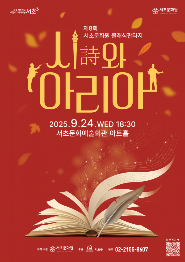 서초구, ‘제8회 클래식 판타지 : 시詩와 아리아’ 개최서초구, ‘제8회 클래식 판타지 : 시詩와 아리아’ 개최 [PEDIEN] 서울 서초구는 오는 9월 24일 오후 6시 30분, 서초문화예술회관 1층 아트홀에서 ‘제8회 클래식 판타지: 시詩와 아리아’를 개최한다고 밝혔다. ‘클래식 판타지’는 매년 가을 클래식 음악을 친숙하게 전달하기 위해 마련된 음악축제로 지역 예술인들에게는 창작과 교류의 기회를 제공함과 동시에 문화예술 활동의 지속성과 다양성을 확대하기 위한 취지로 마련됐다. 이번 공연을 통해 가을밤을 수놓는 시와 아리아의 선율로 깊은 감동과 여운을 선사할 예정이다. 무대에는 △재능시낭송협회 시낭송가 △한국문학예술협회 시낭송가 △아르모니아 중창단 △테너 정의근과 피아니스트 김지연 등이 올라 총 22편의 시 낭송과 중창·성악을 선보인다. 사회는 KBS 박주아 아나운서가 맡는다. "클래식 판타지"는 예스24를 통해 무료 예매가 가능하며 기타 자세한 내용은 서초문화원 홈페이지 또는 전화로 문의하면 된다. 한편 서초문화원은 지역 문화의 보존 및 전승을 위해 2009년 출범한 이후, 다양한 문화 프로그램을 통해 문화예술도시 서초를 만드는 데 앞장서 왔다. 이와 함께 양재천 벚꽃등축제, 수요시네마, 서초아트페스티벌, 차이나는 아카데미, 서초문화대학, 송년음악회, 서초문화관광해설사 전문양성과정, 서초기록활성화사업 등의 사업을 추진하며 특색있는 지역 문화예술기관으로 자리 잡았다. 전성수 서초구청장은 “이번 클래식 판타지 공연이 선사할 문학과 음악의 울림을 통해 주민들이 많은 위로와 기쁨을 느끼길 바란다”고 말했다.