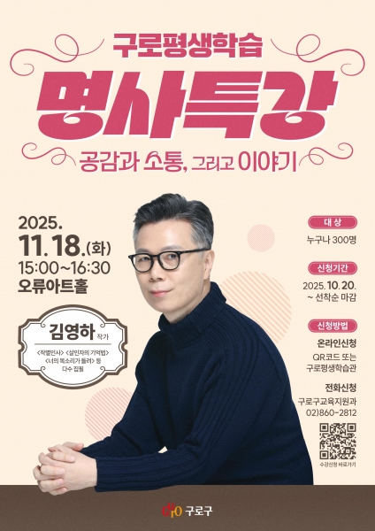 구로구, 소설가 김영하와 함께하는 평생학습 강연 열어 [PEDIEN] 구로구가 오는 11월 18일 오류아트홀에서 김영하 작가를 초청해 ‘구로평생학습 명사특강’을 개최한다. 이번 특강은 평생교육 참여 기회를 확대하고 수준 높은 인문학 강연을 통해 구민의 문화적 감수성과 삶의 통찰을 넓히기 위해 마련됐다. 김영하 작가는 이날 ‘공감과 소통, 그리고 이야기’를 주제로 강연을 진행할 예정이다. 김영하 작가는 ‘살인자의 기억법’, ‘나는 나를 파괴할 권리가 있다’, ‘여행의 이유’ 등 베스트셀러 소설과 산문을 통해 폭넓은 독자층을 보유한 대표적인 한국 문학 작가다. 최근에는 방송 ‘알쓸신잡’ 시리즈와 강연 등을 통해 대중과 적극 소통하고 있다. 특강은 오후 3시부터 4시 30분까지 진행되며 참가비는 무료다. 수강 신청은 10월 20일부터 선착순으로 접수하며 구로평생학습관 누리집 또는 큐알코드, 전화를 통해 신청할 수 있다. 모집인원은 총 300명이며 구로구민과 구로구 내 직장인이 대상이다. 구는 이번 특강을 포함해 연중 총 3회에 걸쳐 다양한 분야의 명사를 초청해 평생학습 강좌를 운영하고 있다. 앞서 배우 차인표, 의사 정희원 박사 등이 초청돼 큰 호응을 얻은 바 있다. 구로구는 앞으로도 폭넓은 학습 기회를 제공해 주민 중심의 평생학습도시로서 입지를 강화해 나갈 계획이다. 장인홍 구로구청장은 “김영하 작가의 이야기를 통해 구민들이 공감과 위로를 얻는 시간이 되길 바란다”며 “누구나 쉽게 배우고 공감할 수 있는 배움의 장을 지속적으로 넓혀가겠다”고 밝혔다. -