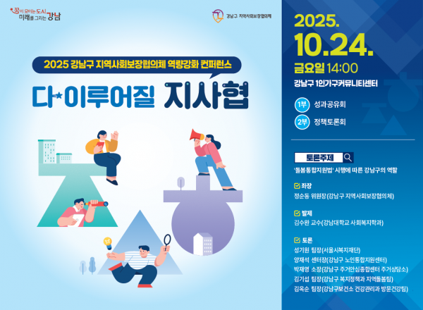 강남구, 지역사회보장협의체 역량 강화 컨퍼런스 개최 [PEDIEN] 꿈이 모이는 도시, 미래를 그리는 강남구가 오는 10월 24일 오후 3시부터 5시 30분까지 강남구 1인가구커뮤니티센터에서 지역사회보장협의체 위원 및 담당 공무원 등 100여명이 참석하는 ‘강남구 지역사회보장협의체 역량강화 컨퍼런스’를 개최한다. 이 행사는 한 해 동안 추진된 복지사업의 성과를 공유하고 우수 활동사례를 조명하는 동시에, 민·관이 함께 복지정책의 미래 방향을 고민하는 자리로 마련됐다. 행사는 크게 두 부분으로 구성된다. 1부 성과공유회에서는 지역사회보장협의체의 사업 성과 발표, 유공자 표창, 우수 활동사례 발표가 이어진다. 우수 사례로는 논현2동보장협의체의 ‘강남형 ESG 민간협력 활성화’ 사업과 사회적고립예방분과의 사회적 고립 예방을 위한 1인 가구 통합 안내서인 ‘혼자서도 괜찮은 삶’ 발간 사업 등 총 4건이 선정됐다. 구는 이날 공유된 사업들을 구 홈페이지 지역사회보장협의체 게시판에 공개하고 활동집을 제작해 배부할 예정이다. 2부 정책토론회는 ‘돌봄통합지원법 시행에 따른 강남구의 역할’ 이라는 주제로 열린다. 정순둘 민간위원장이 좌장을 맡고 김수완 강남대학교 사회복지학과 교수가 ‘강남구 스마트 의료·돌봄 통합지원 체계 구축’을 주제로 발제한다. 패널 토론에는 성기원 서울시복지재단 통합돌봄지원팀장, 양재석 강남구 노인통합지원센터장, 박재영 주거안심종합센터장, 김기섭 강남구 복지정책과 지역돌봄팀장, 김옥순 강남구보건소 건강관리과 방문건강팀장 등이 참여해 내년도 돌봄통합지원법 시행에 앞서 강남구의 대응 과제를 심도 있게 논의할 예정이다. 2005년 설립된 강남구 지역사회보장협의체는 대표협의체, 실무협의체, 실무분과, 동 협의체 등으로 구성돼 있으며 총 385명의 위원이 활동 중이다. 이들은 수평적 네트워크를 통해 복지 사각지대를 발굴하고 주민 삶의 질 향상을 위한 다양한 사업을 수행하고 있다. 조성명 강남구청장은 “지역사회보장협의체 위원들의 헌신과 노력 덕분에 강남구가 복지 도시로 한 걸음 더 나아갈 수 있었다”며 “앞으로도 민관이 힘을 모아, 주민이 변화를 체감할 수 있는 실질적인 복지 정책을 꾸준히 확대해 나가겠다”고 말했다. -