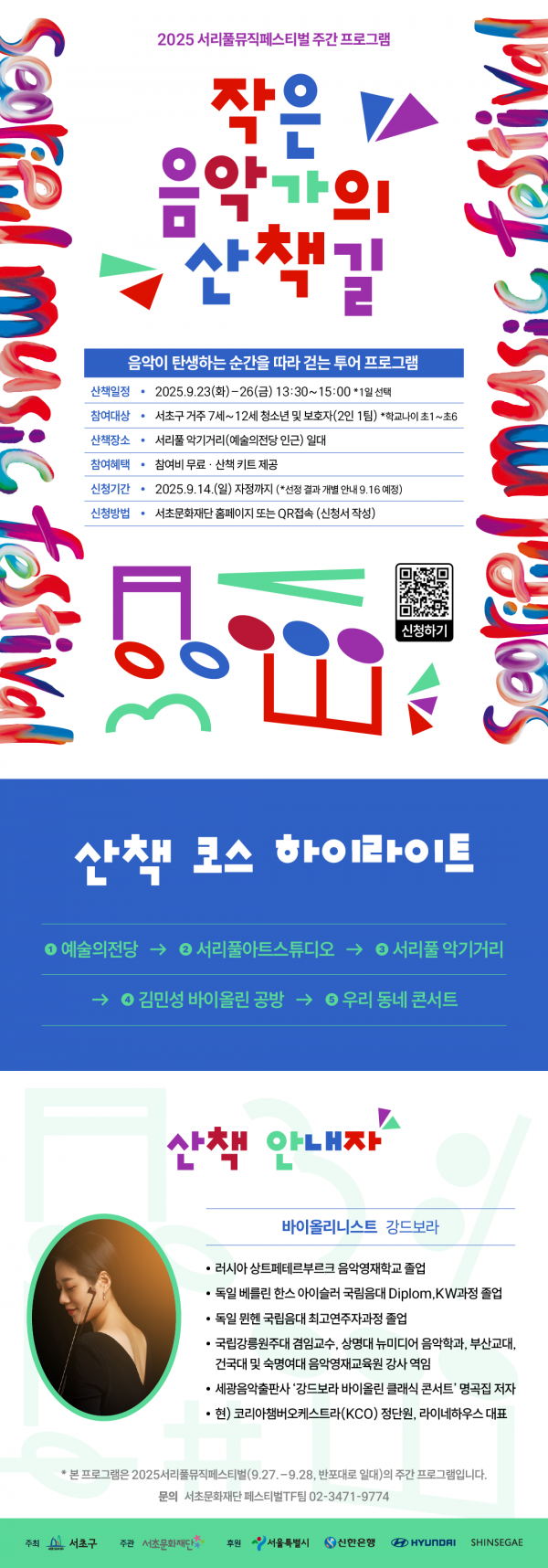 서리풀뮤직페스티벌 화려한 붐업 예술의전당 일대서 특별 프로그램 운영서리풀뮤직페스티벌 화려한 붐업 예술의전당 일대서 특별 프로그램 운영 [PEDIEN] 서울 서초구는 서초의 대표적 음악축제 ‘서리풀뮤직페스티벌’ 개최에 앞서 예술의전당과 서리풀 악기거리 일대에서 주간 특별 프로그램을 운영한다고 밝혔다. 먼저, 9월 25일~26일 예술의전당과 신세계센트럴에서는 주민이 직접 피아노 앞에 앉아 공연을 펼치는 오픈 스테이지 프로그램 ‘터치 더 피아노’ 가 열린다. 참가자는 사전 모집을 통해 선발되며 개인 또는 팀 단위로 자유로운 무대를 꾸밀 수 있다. 구는 이를 통해 클래식의 문턱을 낮추고 주민들의 음악 경험을 확장하는 소중한 기회가 되길 기대하고 있다. 참가 신청은 9월 16일까지 온라인 접수와 연주 영상 제출을 통해 가능하다. 9월 23일~26일 서리풀 악기거리에서는 음악가의 일상과 공간을 체험하는 도보형 프로그램 ‘작은 음악가의 산책길’ 이 진행된다. 예술의전당 무대 탐방을 시작으로 서리풀아트스튜디오, 악기 공방, 클래식 연습실 등을 둘러보며 음악이 만들어지는 과정을 가까이에서 경험하고 악기 장인과 연주자의 이야기를 직접 들을 수 있다. 주민들의 뜨거운 반응으로 모집은 마감됐으며 선정 결과는 16일에 개별적으로 안내될 예정이다. 두 프로그램의 자세한 내용 및 신청은 서초문화재단 홈페이지에서 가능하며 궁금한 점은 서초문화재단로 문의하면 된다. 한편 9월 27일부터 28일까지 개최되는 ‘2025 서리풀뮤직페스티벌’은 올해로 10주년을 맞으며 더욱 특별하게 돌아왔다. 반포대로 900m 구간은 거대한 스케치북이 됨과 동시에 초대형 도심 공연장으로 꾸며지고 세계적인 소프라노 ‘조수미’ 와 클래식계의 아이돌이자 서초구의 제1호 홍보대사 ‘대니 구’, 국내 대표 힙합 그룹 ‘에픽하이’ 등의 정상급 출연진들이 화려한 무대를 선보인다. 이와 함께 가을밤을 달구는 재즈 콘서트, 반포대로에서 즐기는 모닝요가, 언남초 전통예술단의 퍼레이드, 남녀노소 누구나 참여해 즐길 수 있는 체험 부스 등도 마련된다. 구는 축제 전역을 주민과 관광객이 함께 어울리는 ‘열린 음악의 장’ 으로 만들어 명실상부한 대한민국 대표 음악축제로 자리매김하겠다는 계획이다. 전성수 서초구청장은 “이번 주간 프로그램은 축제를 미리 즐기고 체험할 수 있는 예고편”이라며 “많은 주민들이 참여해 즐거운 음악 경험을 함께 나누길 바란다”고 말했다.