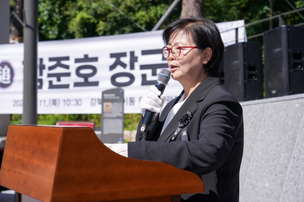 이순희 강북구청장, 함준호 장군 전사지비 이전 추모식 참석이순희 강북구청장, 함준호 장군 전사지비 이전 추모식 참석 [PEDIEN] 이순희 서울 강북구청장이 11일 우이동 만남의 광장에서 열린 ‘함준호 장군 전사지비 이전 추모식’에 참석했다. 함준호 장군은 6·25전쟁 당시 제7사단 1연대장으로서 동두천, 의정부, 창동, 도봉산 일대 방어전을 이끌다 1950년 6월 27일 전사한 호국영웅으로 정부로부터 태극무공훈장과 준장 1계급 특진이 추서된 인물이다. 장군 전사지비는 후대가 애국정신을 기억할 수 있도록 우이동 만남의 광장으로 새롭게 이전됐다. 이날 행사는 무공수훈자회 강북구지회 주관으로 유족, 당협위원장 및 구의원 등 내빈, 보훈단체장 및 회원 등 250여명이 자리한 가운데 진행됐다. 개회식을 시작으로 추진경과 보고 헌화, 추모사, 유족 인사, 군가 제창 순으로 이어지며 장군의 숭고한 희생을 기리고 호국정신을 되새기는 시간을 가졌다. 이순희 강북구청장은 “함준호 장군님의 애국정신을 길이 기억할 수 있는 공간을 마련하게 된 것을 매우 뜻깊게 생각한다”며 “강북구는 국가유공자와 보훈가족의 공훈을 선양하고 호국정신이 대대로 이어질 수 있도록 최선을 다하겠다”고 밝혔다.
