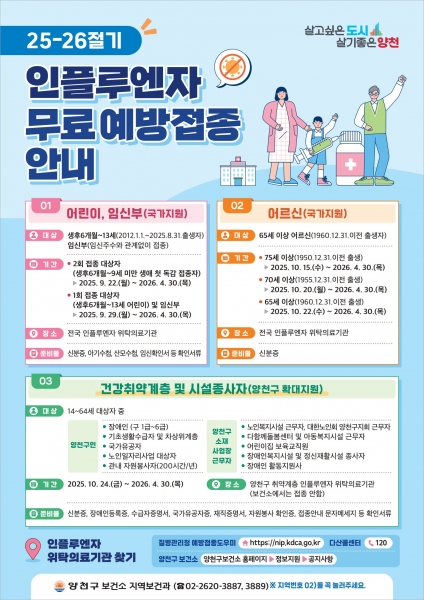 양천구, 서울시 최대 범위 독감 무료접종 지원…자체지원 1만명에서 3만명으로 늘려양천구, 서울시 최대 범위 독감 무료접종 지원…자체지원 1만명에서 3만명으로 늘려 [PEDIEN] 양천구는 겨울철 호흡기 감염병 유행에 선제적으로 대응하고 질병으로부터 구민들을 보호하고자 인플루엔자 무료 예방접종 대상을 확대한다고 15일 밝혔다. 구는 65세 이상 어르신, 13세 이하 어린이, 임산부만 해당되는 국가 무료접종의 사각지대를 해소하기 위해 그간 의료급여수급자, 중증장애인, 국가유공자 등 약 1만명에 독감 예방접종을 자체적으로 지원해 왔다. 그러나 최근 겨울철 독감 환자가 급증하고 재유행 우려가 커지면서 구는 감염 취약계층과 복지시설 종사자까지 보호망을 넓히기로 했다. 이를 위해 구는 지난 6월 ‘서울특별시 양천구 인플루엔자 예방접종 지원에 관한 조례’를 개정하고 추가경정예산 3억원을 확보했다. 이번 조치로 기초수급자와 차상위계층, 등록장애인 등이 올해부터 독감 예방접종을 무료로 받게 된다. 이에 더해 고위험군과 밀접 접촉하는 어린이집 보육교직원, 노인복지시설 종사자, 장애인복지시설 근무자, 장애인 활동지원사 등이 새롭게 지원 대상에 포함됐다. 지원 대상 범위로는 서울시 전체 자치구 가운데 가장 많은 규모다. 접종은 오는 10월 24일부터 양천구 내 위탁의료기관 128곳에서 실시된다. 사용되는 백신은 국가 무료 지원과 동일한 ‘인플루엔자 3가 백신’ 이며 의료기관 명단은 양천구보건소 홈페이지에서 확인할 수 있다. 국가 무료 지원 대상인 어르신·어린이·임산부는 이달 22일부터 거주지와 상관없이 전국 위탁의료기관에서 순차적으로 접종할 수 있다. 대상자별 세부 일정과 의료기관은 질병관리청 ‘예방접종도우미’ 홈페이지에서 확인 가능하다. 이기재 양천구청장은 “구민의 건강을 지키는 인플루엔자 무료접종 대상 확대를 위해 조례와 예산 확보 등 여름에 겨울을 준비했다”며 ”구는 앞으로도 전염병 등 각종 질병으로부터 구민을 보호하기 위해 최선의 노력을 다하겠다"고 말했다.