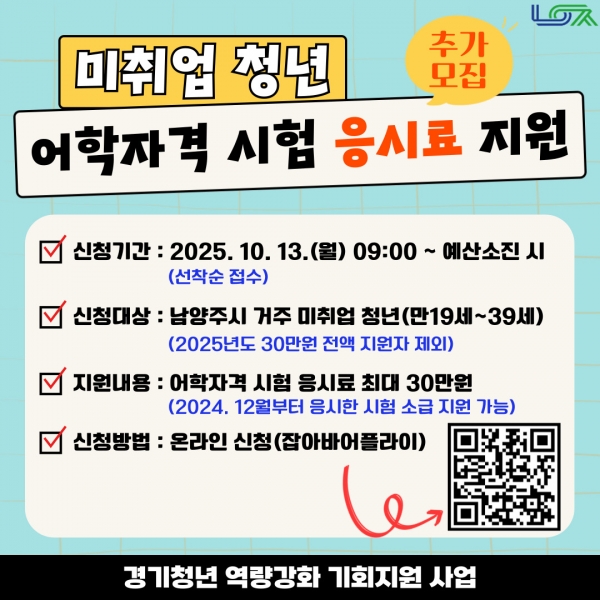 남양주시, 미취업 청년 대상 어학·자격 시험 응시료 지원 추가모집 [PEDIEN] 남양주시는 10월 13일부터 미취업 청년을 대상으로 어학·자격 시험 응시료 지원 신청을 추가로 받는다고 2일 밝혔다. 이번 사업은 높은 청년 수요로 조기 마감된 어학·자격 시험 응시료 지원을 확대하기 위해 마련됐다. 시는 경기도 예산을 추가 확보해 더 많은 청년이 지원받을 수 있도록 했다. 신청 대상은 신청일 기준 시에 주민등록이 돼 있는 만 19세부터 39세까지의 미취업 청년이다. 신청은 예산 소진 시까지 선착순으로 진행되며 연간 1인 최대 30만원 한도 내에서 횟수 제한 없이 지원된다. 단, 올해에 이미 30만원 전액을 지원받은 청년은 이번 추가지원 대상에서 제외되고 일부 금액만 지원받은 경우에는 남은 금액 한도 내에서 추가 신청이 가능하다. 또한, 2024년 12월 이후 응시한 시험에 한해 소급 지원도 가능하다. 신청은 경기도 일자리 플랫폼 ‘잡아바 어플라이’를 통해 온라인으로 할 수 있다. 응시 확인서와 결제 영수증 등 구비서류를 제출해야 하고 요건이 충족되면 본인 계좌로 실비 지급된다. -