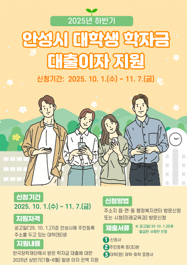 ‘2025년 하반기 안성시 대학생 학자금 대출이자 지원’ 11월 7일까지 접수