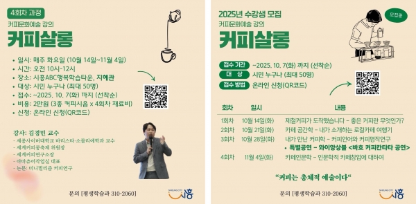 [PEDIEN] 시흥시는 민간주도형 지역축제 지원사업인 ‘2025년 시흥시 지역특화 관광축제 지원사업’에 선정된 ‘세계 커피콩 축제’의 사전 연계 프로그램으로 커피문화예술 특강 ‘커피살롱’을 오는 10월 14일부터 11월 4일까지 시흥ABC행복학습타운 지혜관에서 총 4회에 걸쳐 진행한다.