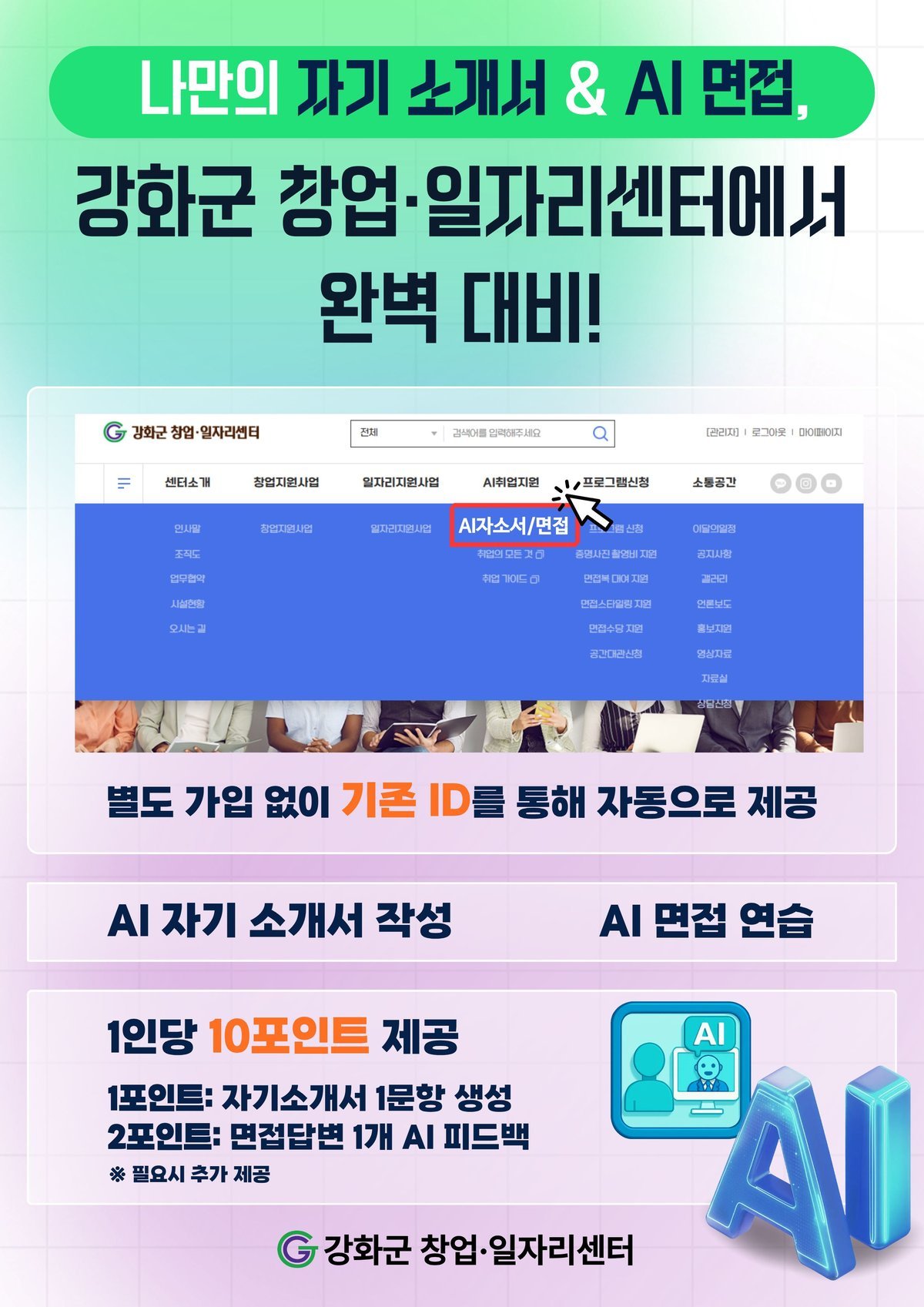 강화군 창업‧일자리센터, AI 취업 지원 서비스 본격 가동 (강화군 제공) [PEDIEN] 강화군 창업·일자리센터가 12월부터 AI 기술을 활용한 취업 지원 서비스 운영을 시작한다고 밝혔다.이번에 도입한 ‘AI 취업 지원 서비스’는 자기소개서 작성부터 면접 연습, 직무적합도 분석까지 취업의 전 과정을 디지털을 기반으로 지원하는 통합형 서비스이다.해당 서비스는 강화군 창업‧일자리센터 홈페이지와 연동돼 홈페이지에서 로그인한 후, AI 자기소개서‧면접 메뉴를 통해 누구나 무료로 이용할 수 있다.이용자가 입력한 경험을 기반으로 AI 자기소개서를 자동 작성‧첨삭하고, 카메라 기반 AI 모의 면접 기능을 통해 면접자의 행동‧내용을 종합 분석해 개선 사항을 제시한다.센터는 이번 AI 취업 지원 서비스 도입이 청년층과 경력 단절 여성, 중장년 구직자 등 다양한 계층의 취업 접근성을 높이고 경쟁력을 강화하는 전환점이 될 것으로 기대하고 있다.오윤근 센터장은 “급변하는 고용 환경에 대응해 강화군도 디지털 기반 일자리 서비스를 단계적으로 강화할 것”이라며, “누구나 쉽게 접근할 수 있는 AI 취업 지원 서비스가 구직자들에게 실질적인 도움이 되기를 바란다”고 말했다.AI 취업 지원 서비스와 관련한 자세한 사항은 강화군 창업‧일자리센터 홈페이지를 통해 확인하거나 유선으로 문의하면 된다. -