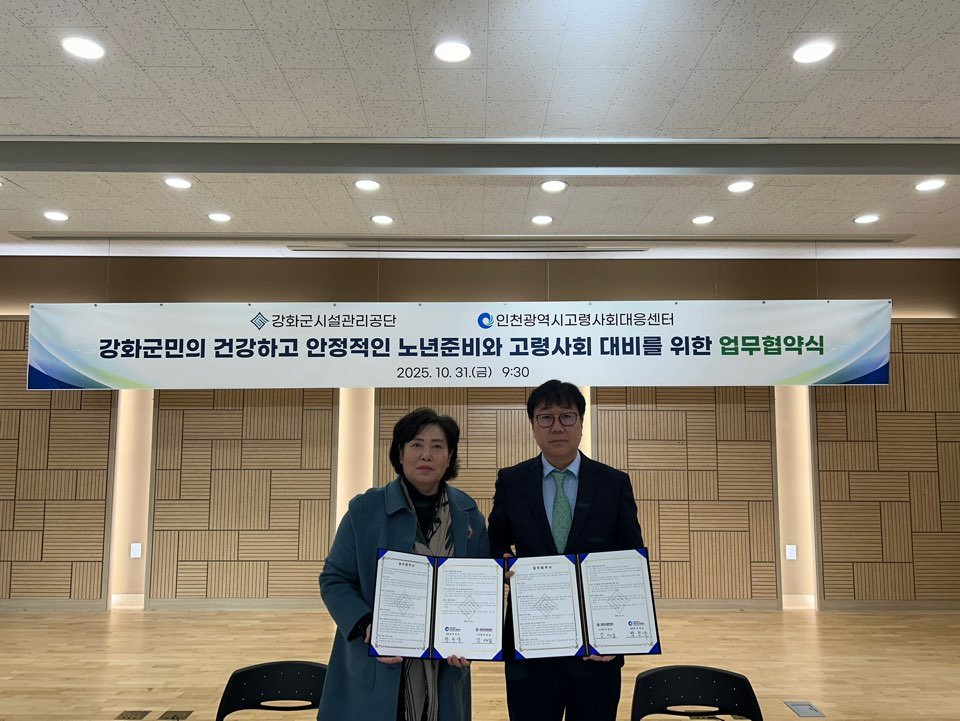 강화군시설관리공단 인천광역시 고령사회 대응센터와 업무협약 체결 [PEDIEN] 강화군이 고령화 사회에 적극적으로 대응하기 위해 인천광역시 고령사회대응센터와 손을 잡았다.강화군시설관리공단은 지난 31일 인천광역시 고령사회대응센터와 업무협약(MOU)을 체결, 군민들의 건강하고 안정적인 노후 준비를 위한 협력 체계를 구축했다고 밝혔다.이번 협약은 고령사회 대비를 위한 양 기관의 전문성을 강화하고, 성공적인 목표 달성을 위한 상호 협력을 증진하는 데 목적을 두고 있다. 양 기관은 보유한 역량과 자원을 최대한 활용하여 시너지 효과를 창출할 계획이다.특히 이번 MOU를 통해 인천광역시 고령사회대응센터는 재무, 건강, 여가, 관계 등 4대 영역에서 강화군민에게 맞춤형 서비스를 제공할 예정이다. 이를 통해 군민들은 더욱 건강하고 풍요로운 노후를 준비할 수 있을 것으로 기대된다.박영길 강화군시설관리공단 이사장은 "이번 협약을 통해 강화군민의 건강한 삶을 위해 최선을 다하겠다"고 밝혔다. 양 기관의 협력이 강화군의 고령화 문제 해결에 긍정적인 영향을 미칠 것으로 전망된다. -