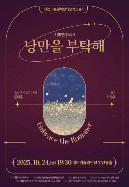 아트필하모닉오케스트라“낭만을 부탁해” [PEDIEN] 깊어가는 가을의 정취 속에서 낭만주의 음악의 정수를 느낄 수 있는 무대가 찾아온다. 대전아트필하모닉오케스트라는 기획연주회 II ‘낭만을 부탁해’를 오는 10월 24일 오후 7시 30분, 대전예술의전당 앙상블홀에서 선보인다. 이번 공연은 예술감독 겸 상임지휘자 정치용의 지휘 아래, 음악적 성장을 이어가고 있는 대전아트필이 연주를 하고 감성적이면서도 정교한 연주로 사랑받는 첼리스트 조연우가 협연자로 함께 무대에 오른다. 공연 프로그램은 낭만주의의 감성이 어우러진 다채로운 프로그램으로 구성했다. 멘델스존의 ‘핑갈의 동굴’로 웅장하고 서정적인 서막을 연 뒤, 영화 미션의 감동적인 음악, 엔니오 모리코네 ‘가브리엘 오보에’, 쇼스타코비치의 ‘갯플라이 모음곡’ 중 ‘로망스’ 등 따뜻하고 애잔한 선율로 관객의 감성을 자극한다. 협연자 첼리스트 조연우는 두 편의 낭만 소품을 통해 깊은 음악 세계를 선보인다. 연주곡은 인간 내면의 고요한 기도를 첼로 선율로 승화시킨 브루흐의 명상곡 ‘콜 니드라이’ 와, 우아하고 순수한 첼로의 매력이 돋보이는 생상스의 ‘백조’ 이다. 국내외 주요 무대와 KBS 라디오, 앨범 등을 통해 실력을 인정받은 조연우의 연주가 이번 무대의 감동을 더할 것으로 기대된다. 공연의 피날레는 멘델스존의 교향곡 제5번 ‘종교개혁’ 중 4악장으로 장식한다. 이 곡은 장엄하고 희망적인 분위기로 마무리하며 이번 공연의 주제인 ‘낭만’의 절정과 영적 고양을 동시에 선사할 것이다. 대전아트필 관계자는 “이번 기획연주회는 깊어가는 계절의 정취 속에서 클래식 음악이 가진 본연의 따뜻한 감동과 낭만을 선사할 무대”며 “정치용 지휘자의 섬세한 해석과 첼리스트 조연우의 깊이 있는 협연이 만나 관객들에게 잊을 수 없는 가을밤의 음악 선물을 드릴 것”이라고 전했다. -