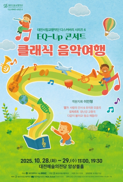 시립교향악단, 어린이를 위한 음악회 EQ-Up 콘서트 [PEDIEN] 대전시립교향악단은 28~29일 이틀 동안 대전예술의전당 앙상블홀에서 EQ-Up 콘서트 ‘클래식 음악여행’을 선보인다. 공연은 이틀 모두 오전 11시와 오후 7시 30분, 총 4회에 걸쳐 진행된다. 이번 공은 아이들이 친근하고 따뜻하게 다가갈 수 있는 클래식 작품들을 중심으로 연주된다. 특히 엘가의 ‘사랑의 인사’, ‘유치원 모음곡’과 모차르트의 ‘장난감 교향곡’ 이 무대에 오른다. 사랑하는 이를 위한 음악적 선물로 탄생한 ‘사랑의 인사’ 와 어린이를 위해 작곡된 ‘유치원 모음곡’은 부드럽고 따스한 선율로 관객들에게 감동을 선사할 것이다. ‘장난감 교향곡’은 다양한 장난감 악기의 흥미로운 음향이 더해져 어린이들에게 즐거운 호기심을 불러일으킬 것으로 기대된다. 이번 공연은 차세대 음악 교육에 앞장서 온 지휘자 이민형의 다채로운 해설과 풍성한 연주로 클래식의 즐거움을 전하며 생애 첫 클래식 경험을 최고의 추억으로 만들어 온 가족이 함께 즐길 수 있는 무대가 될 것이다. 대전시립교향악단의 어린이를 위한 공연은 2009년부터 매년 이어져 온 전통 있는 시리즈로 어린이들의 감성과 지성을 함께 길러줄 수 있는 다채로운 음악들을 선사해 왔다. 미래의 음악 애호가들에게 클래식의 아름다움과 즐거움을 전하는 뜻깊은 자리가 될 전망이다. 티켓은 전 좌석 1만원이며 예매는 공연 전일 오후 5시까지 대전시립교향악단 홈페이지, 대전예술의전당 홈페이지, 놀유니버스에서 가능하다. 연주회의 자세한 사항은 대전시립교향악단 홈페이지를 참조하거나 전화로 문의하면 된다.