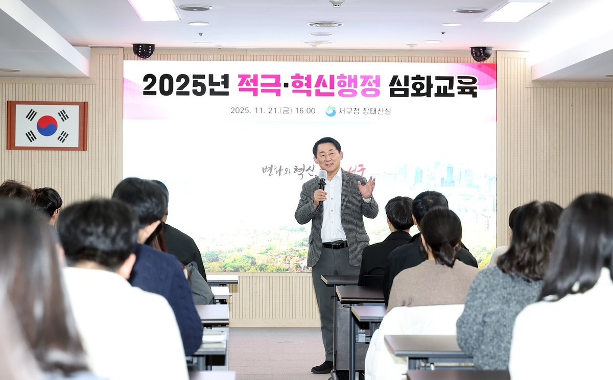 서구청 장태산실에서 열린 대전 서구 적극 혁신 행정 심화 교육 장면 [PEDIEN] 경험 많은 공무원들이 후배들의 행정 역량 강화를 위해 강단에 섰다.대전 서구는 구청 장태산실에서 전 직원 대상 ‘적극·혁신 행정 심화 교육’을 진행했다고 24일 전했다. 이번 교육은 서구의 적극행정 우수 공무원들이 직접 강사로 나서, 본인의 경험을 공유하는 자리로 마련됐다.먼저 김미희 재산세팀장은 다자녀가구 재산세 감면 정책 추진 경험을 소개하며, 정책 발굴부터 제도화 과정까지 주민 체감 행정 구현을 위한 노력에 대해 강연했다.김재환 건축행정팀장은 ‘다가구주택 불법가구분할 OUT’ 사업 추진 과정에서, 민관협력으로 임차인 피해를 예방한 경험을 통해 현장 중심 행정의 중요성을 강조했다.두 강사는 정책 시행 과정에서 마주한 현장 문제와 해결 방법 등을 공유하며, 공직자의 적극적인 역할 수행 필요성에 공감대를 형성했다.서철모 청장은 “적극행정은 주민 불편을 발견하고 해결하는 작은 실천에서 시작된다”며 “서로의 경험을 나누는 문화가 정착돼 행정 혁신이 일상화되길 바란다”고 말했다. -