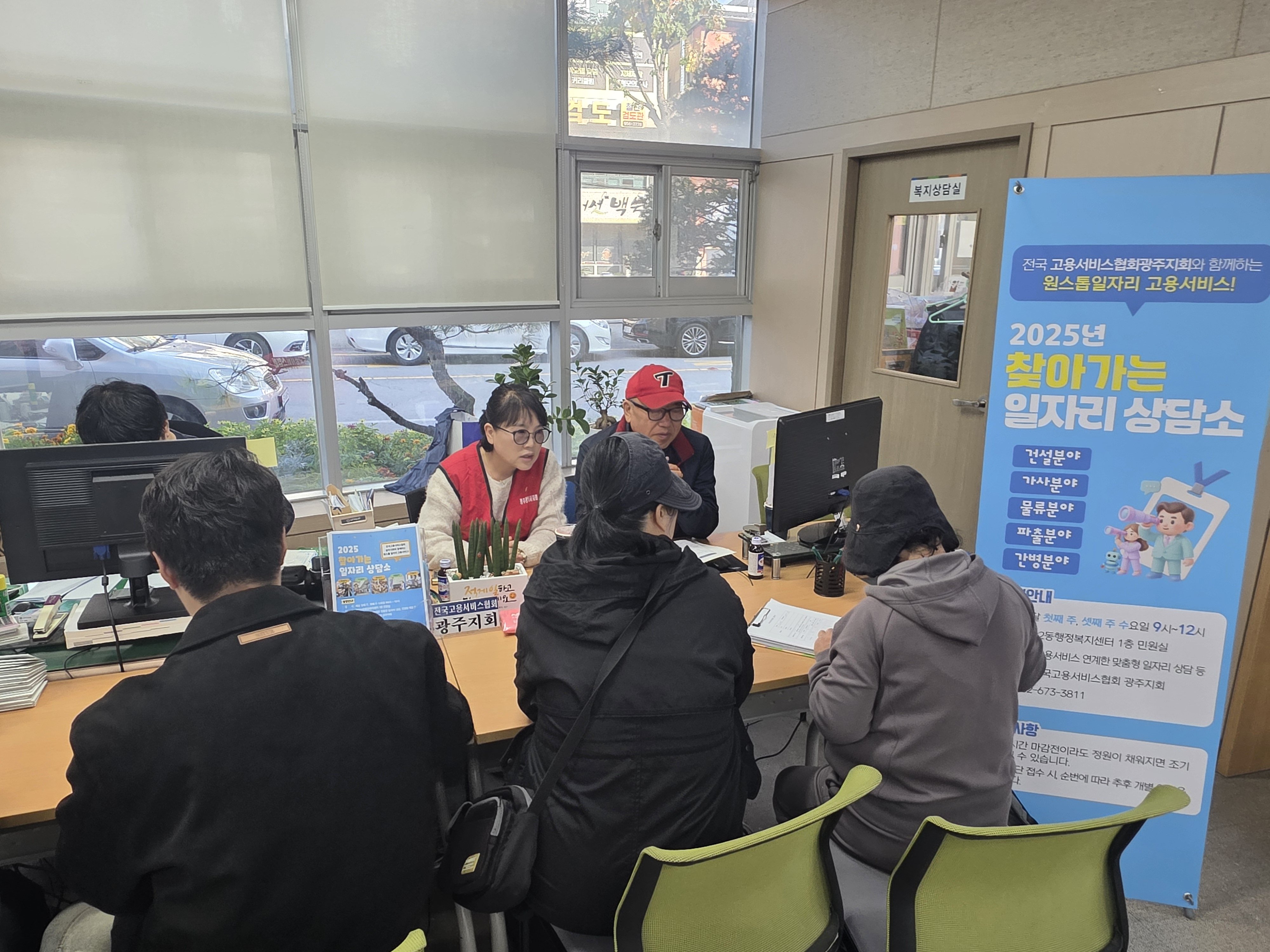 찾아가는_일자리_상담소_운영_사진 (사진제공=광주광산구) [PEDIEN] 광주 광산구 첨단2동이 주민들의 취업 고민 해결을 위해 발 벗고 나섰다.'찾아가는 일자리 상담소'를 개소하고 주민들에게 맞춤형 일자리 지원 서비스를 제공한다.상담소는 첨단2동행정복지센터 1층 민원실에 마련되어 접근성을 높였다.전국고용서비스협회 광주지회와 협력해, 구직을 희망하는 주민들에게 실질적인 도움을 줄 예정이다.상담은 별도 예약 없이 무료로 진행된다.건설, 가사, 물류, 파출, 간병 등 다양한 분야에 대한 상담이 가능하다.구직자들은 상담을 통해 민간 고용 서비스 연계, 맞춤형 취업 상담 및 컨설팅, 구직·구인 정보 등을 제공받을 수 있다.'찾아가는 일자리 상담소'는 12월까지 매달 첫째 주, 셋째 주 수요일 오전 9시부터 정오까지 운영된다.장희정 전국고용서비스협회 광주지회장은 “취업 상담과 구인·구직 정보 제공을 통해 주민들의 취업을 적극 지원하겠다”고 밝혔다.채동훈 첨단2동장은 “주민들에게 실질적으로 도움이 되는 맞춤형 일자리 서비스를 제공하고 지역 경제 활성화에 기여하겠다”고 말했다.첨단2동은 이번 상담소 운영을 통해 주민들의 취업 역량을 강화하고 더 나아가 지역 경제 활성화에도 긍정적인 영향을 미칠 것으로 기대하고 있다. -